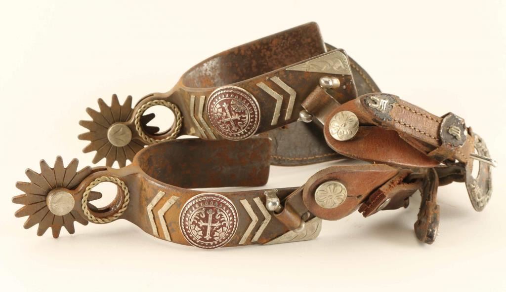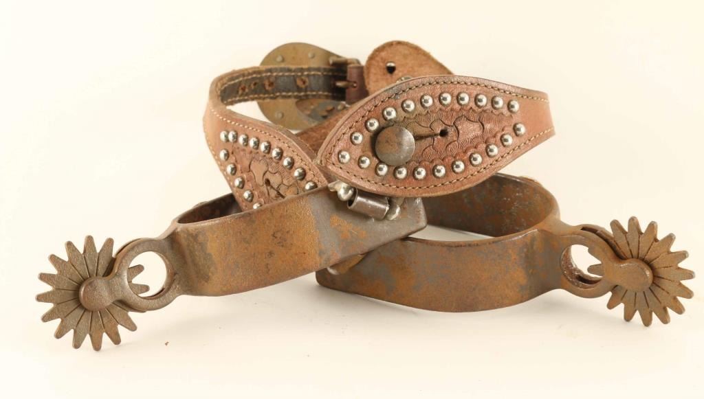 Single mounted overlay with arrows and concho with cross, sixteen point rowels, not marked, floral tooled spotted brown leather straps, fair condition little rusty could clean.
