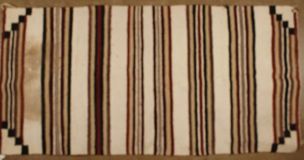Striped pattern in brown, white and black. Measures 62"x30". In fair condition shows some staining to scattered areas.