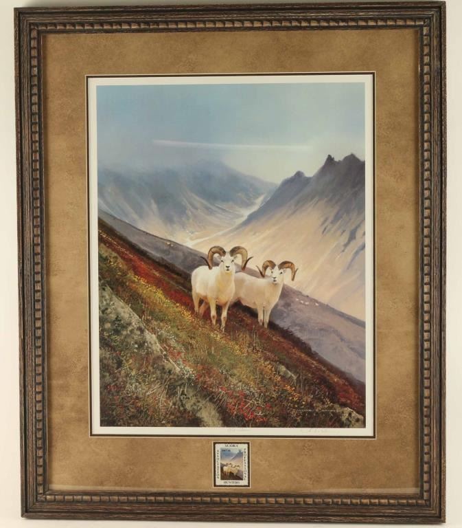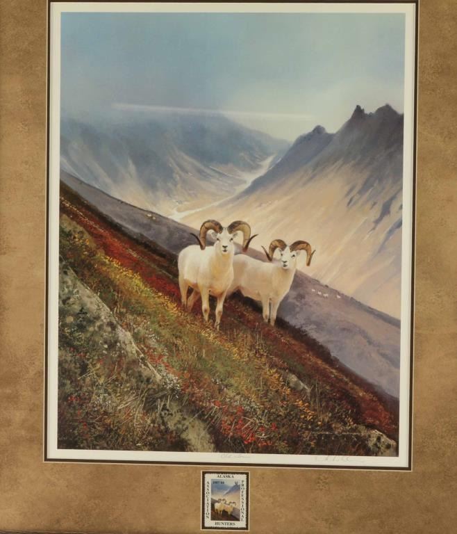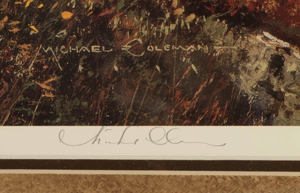 entitled "Old Timers" this Michael Coleman print is double matted and framed with an image size of 15" by 19". Signed in the lower right hand corner with a postal stamp with the painting on it directly below the print.