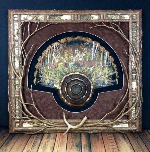 This original, hand painted turkey tail fan is a one of a kind painting by wildlife artist Erich Carlson! This awesome work of art is titled “Still Getting Along” and depicts two pair of Whitetail deer. The artwork is painted on a beautiful, full-fan of an Eastern Wild Turkey harvested in Northeast Michigan. It is uniquely presented in a suede shadow box with an anti-reflective glass protecting the painting. This work of art is complemented by one of Erich’s uniquely handcrafted Cedar and Birch frames and accented with a shed antler. Buyer has the option of selecting this painting or a similar, custom work to be completed at a later date. Don’t miss out on this stunning original work of art!