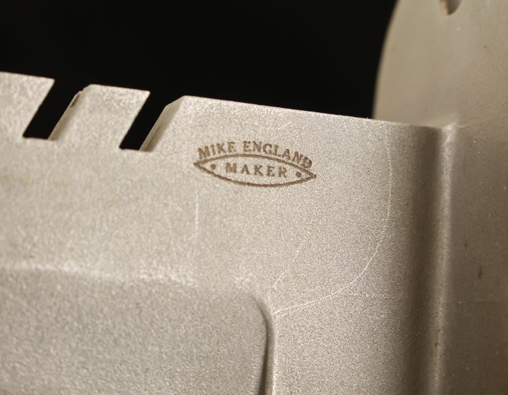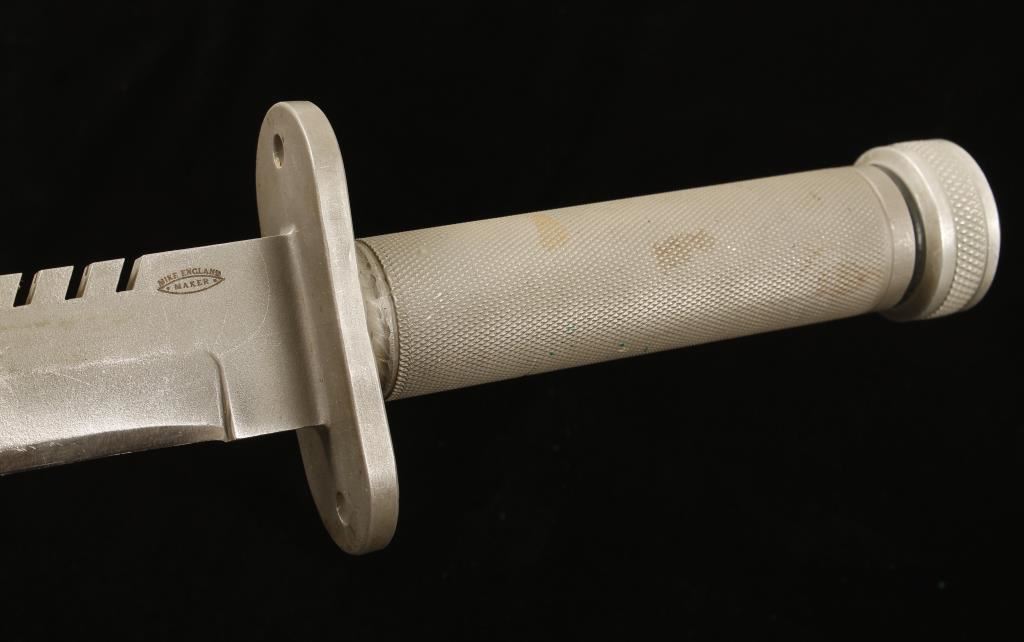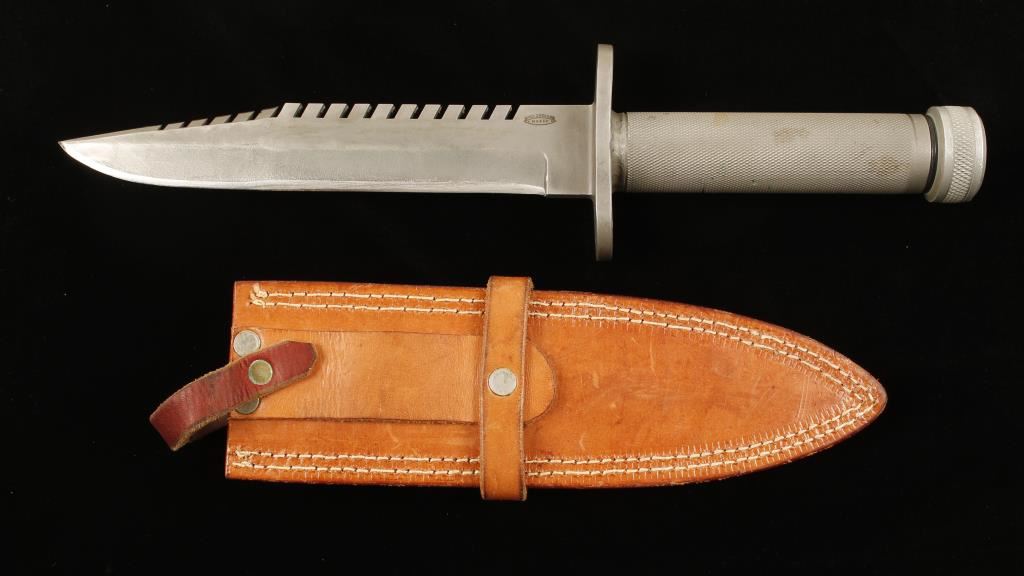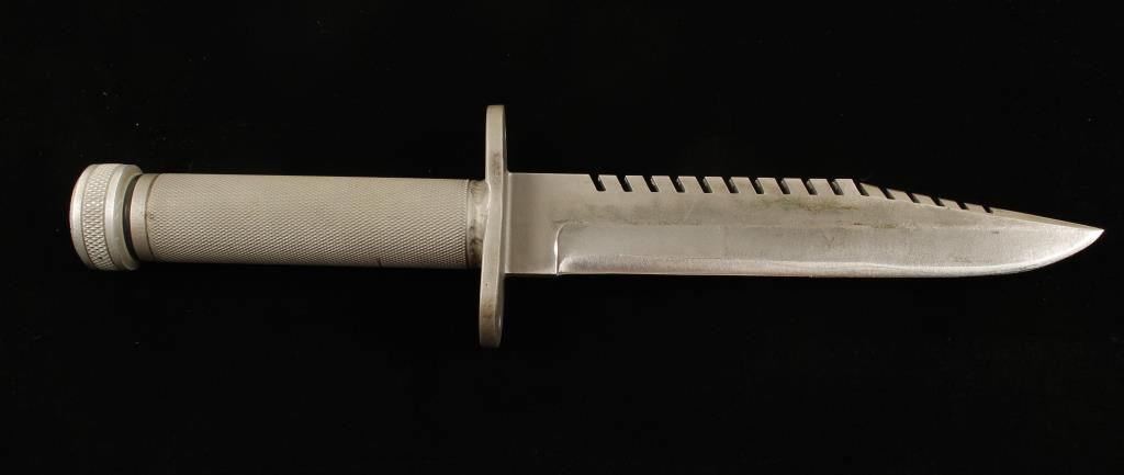 Mike England Custom survival knife, approx. 14-1/2” overall with an 8-1/2” blade, hollow grip for storage. Overall Good condition showing some sharpening and scratches on blade. Accompanied by an unmarked heavy leather sheath that shows some wear.