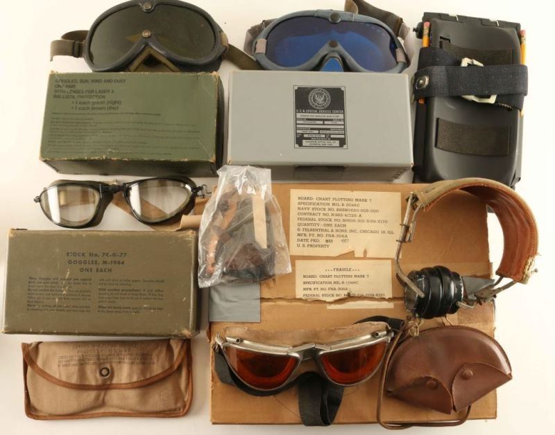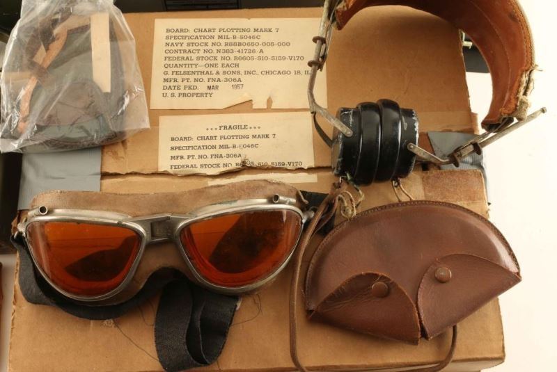 Including; Military Blind Flying Goggles, 2 pairs sun, wind and dust goggles, pilot's lap board, ear phones, 2 other pairs of goggles, lenses, and a Chart Plotting Mark 7 Board in original box with label.