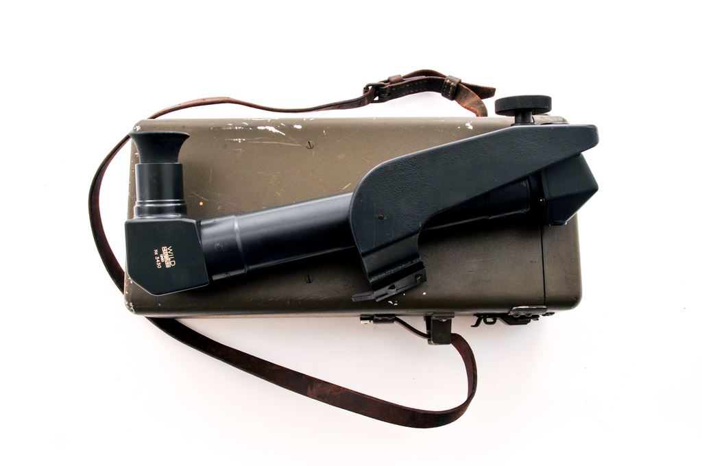 Military Periscope, marked ''Wild Heerbrugg 1960 No. 3430'', contained in the original carrying case with a good leather shoulder strap. Container and periscope are both in very good condition. Est.: $200-$300. (Joe Poyer collection)