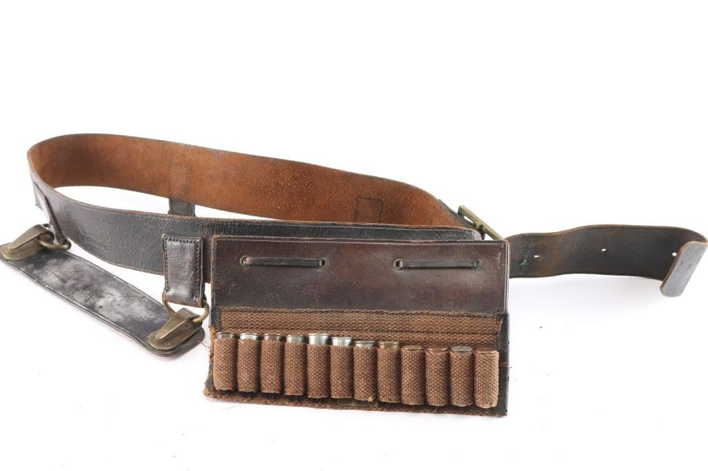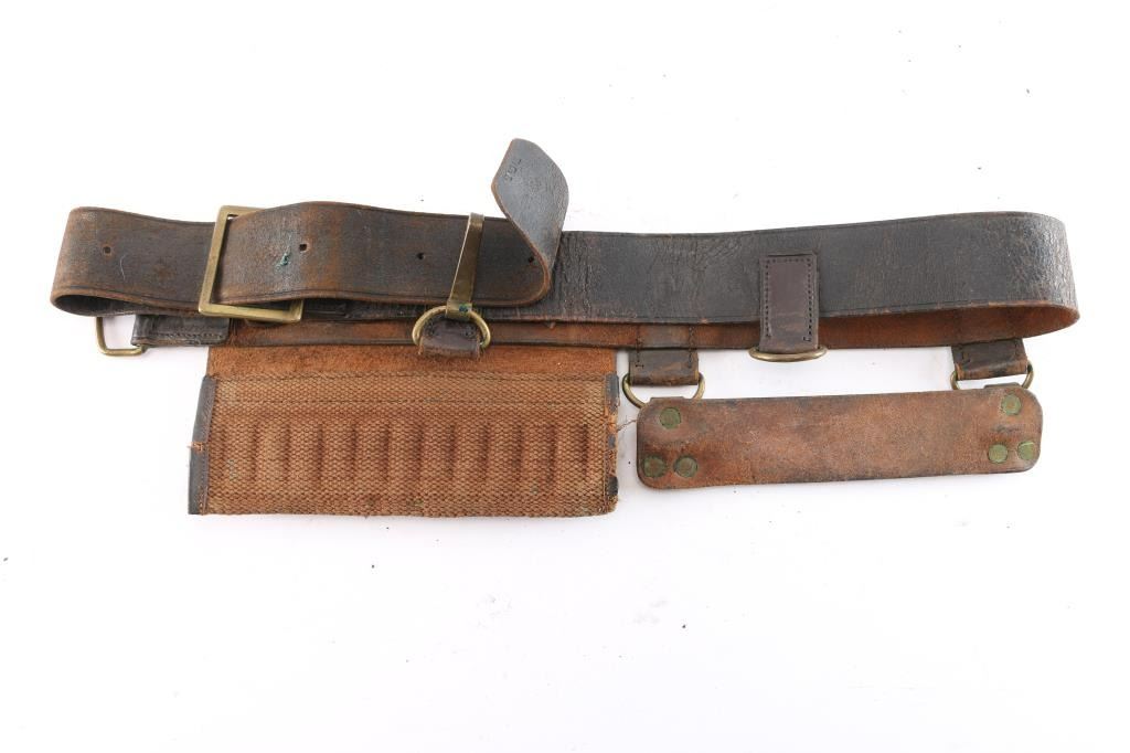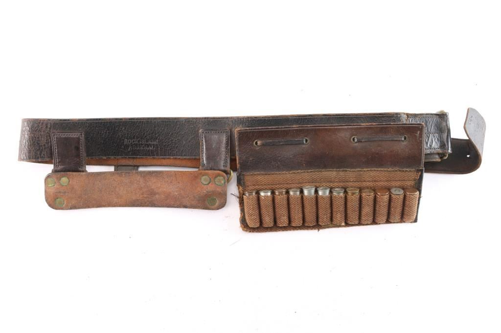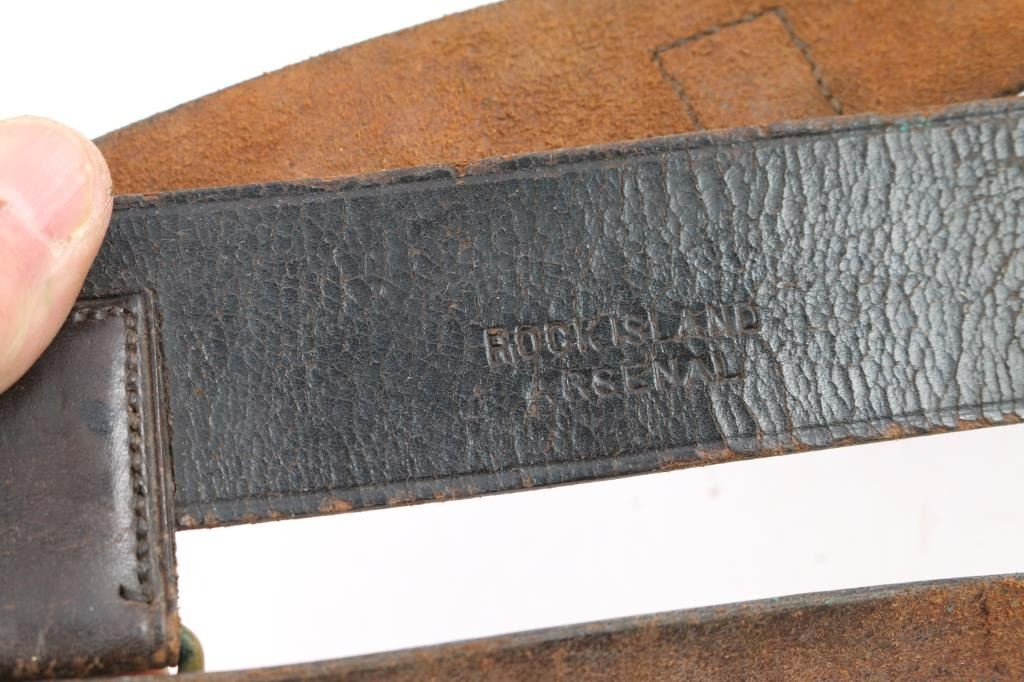 Possibly experimental Mills .45 LC pistol cartridge carrier on Rock Island marked leather and brass mounted combination utility belt. Refer Meadows pg. 396 identifies the Mills carrier as Mills and a small brass plate reads Anson Mills Dec 28 - 1880. Condition is good to V.G. with minor fraying at ends and cracking with normal age to leather. Kopec inventory indicates a value of $2,000 many years ago. The estate of John Kopec.