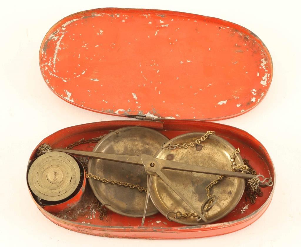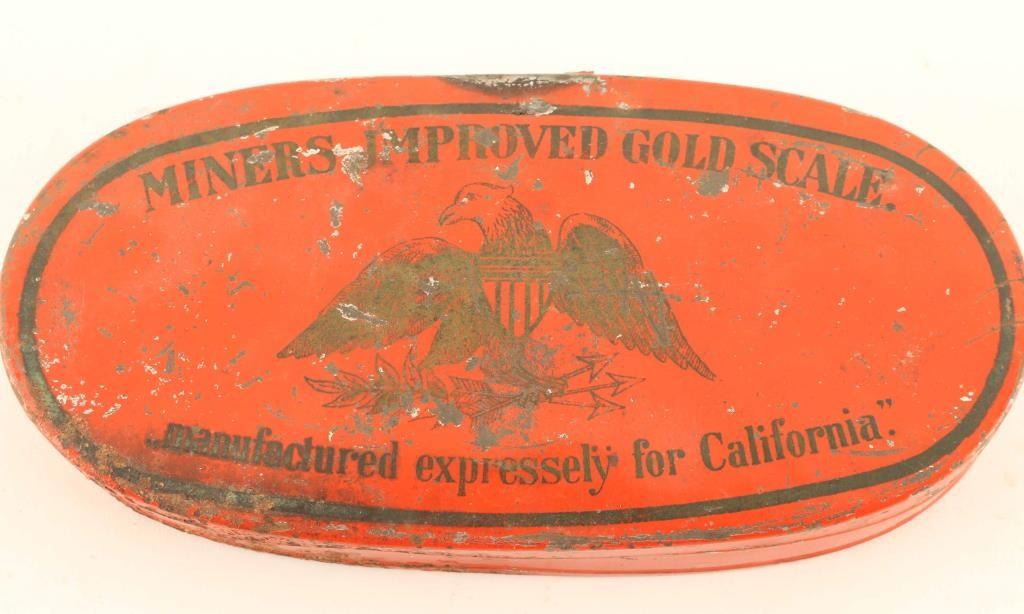 From the California Gold Rush Era gold scale in tin case marked "Miners Improved Gold Scale manufactured expressely for California". Scale is complete and Includes all weights.