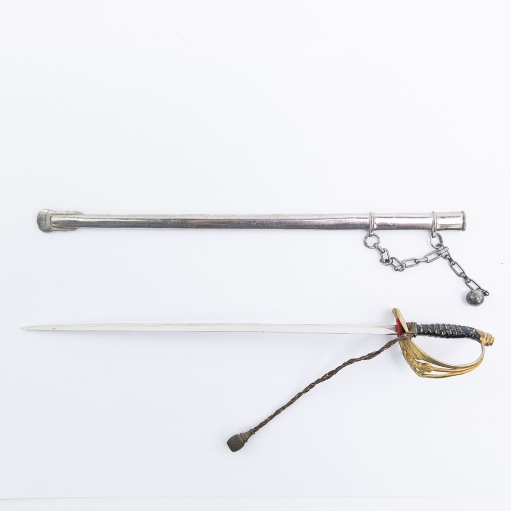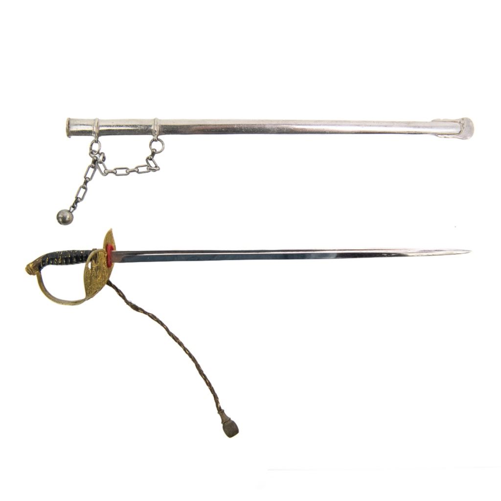 Miniature sword was most likely made in the post WWI period to Nazi era. It is 9.75" L and in very good condition. It does have some black painted grip and the portepee shows age. The unmarked blade is very bright with some minor in/out wear and has no flaking to the chrome. The detail on the crossguard is very good and hanger chain is present with an unusual steel ball at end of hanger.