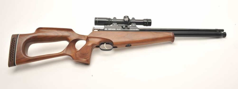 Mirage XLR pellet gun, .177 caliber, 17” barrel, black finish, checkered wood thumb hole/open wood stock, S/N XLR 2072, mounted with a Burris 4X Compact score displaying fine optics. This pellet gun is in overallfine condition with majority of original finish and fine wood; appears to be functioning at time of description. Est.: $150-$300.