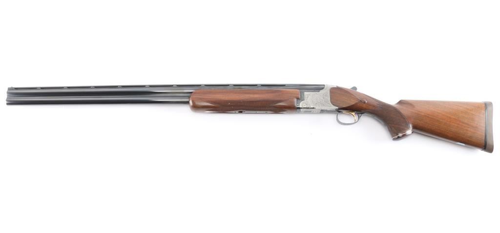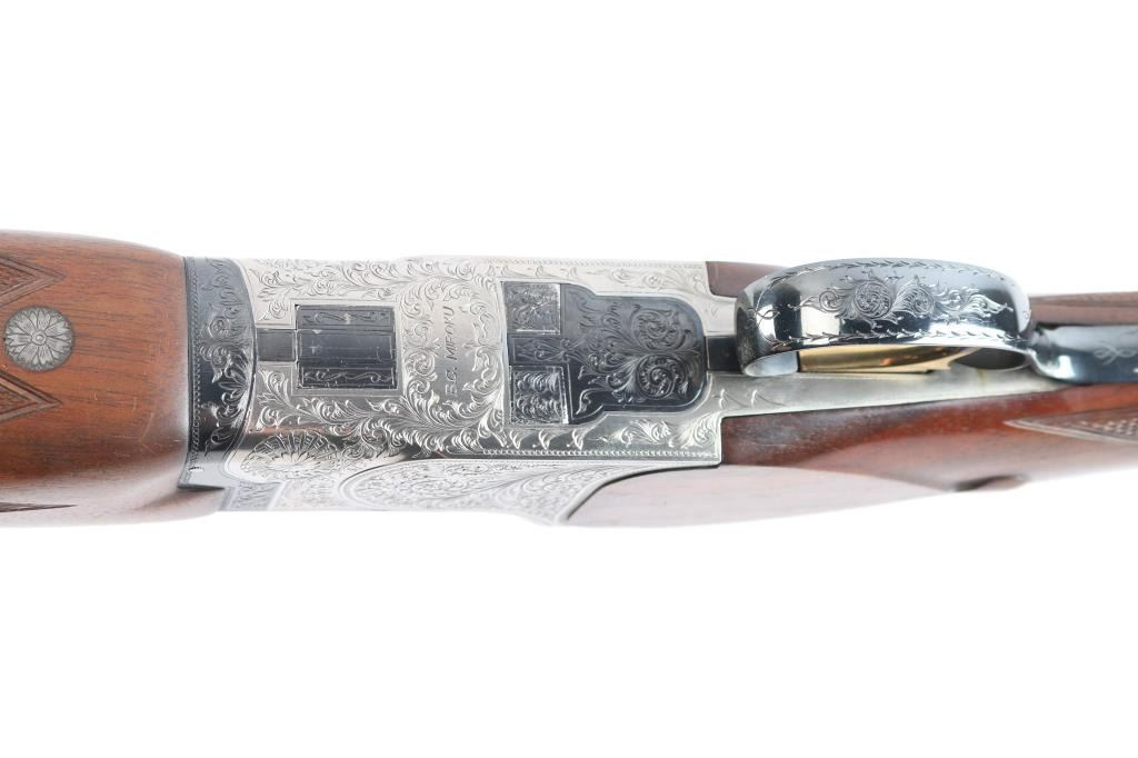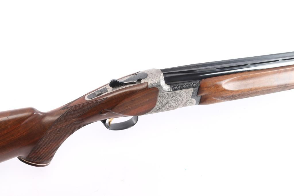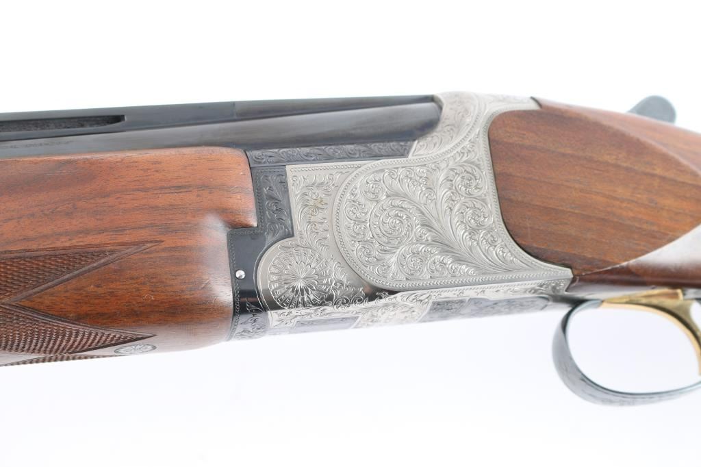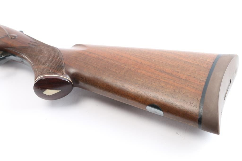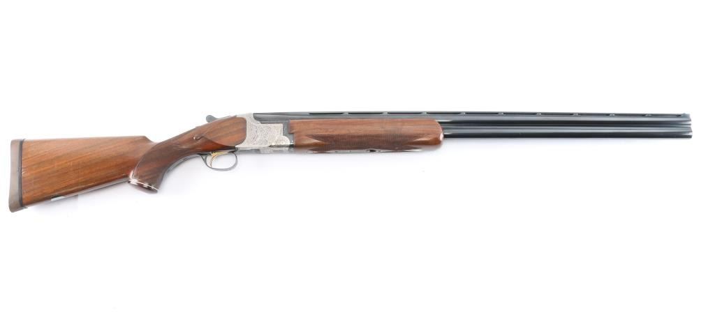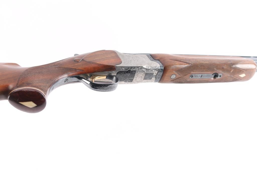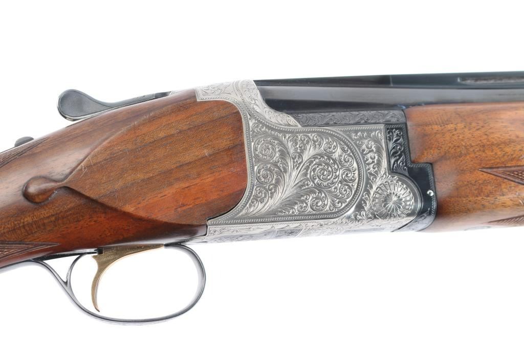 High quality Japanese O/U "High Special Trap" 12 GA shogun. Features 30" barrels with fixed Full / Imp Cyl chokes, Broadway style flat trap rib and solid-side ribs. High polish blued barrels. Nickel finished action featuring fine floral/scroll engraving, high polish blue triggerguard. top lever and safely. Factory Monte Carlo trap stock with spacer to 13 1/4" LOP, contrasting wood pistol grip with spacer and trap beavertail forearm, both with white diamond inserts. Double triggers, tang safety, barrel selector, auto extractors, gold toned trigger. Bores are excellent/bright, blue is about 97% with a few very minor scratches, wood is overall excellent with a few minor scratches/dings and the receiver is excellent. Mechanically in excellent condition. Matching serial numbers. Consigner purchased this shotgun in Japan.