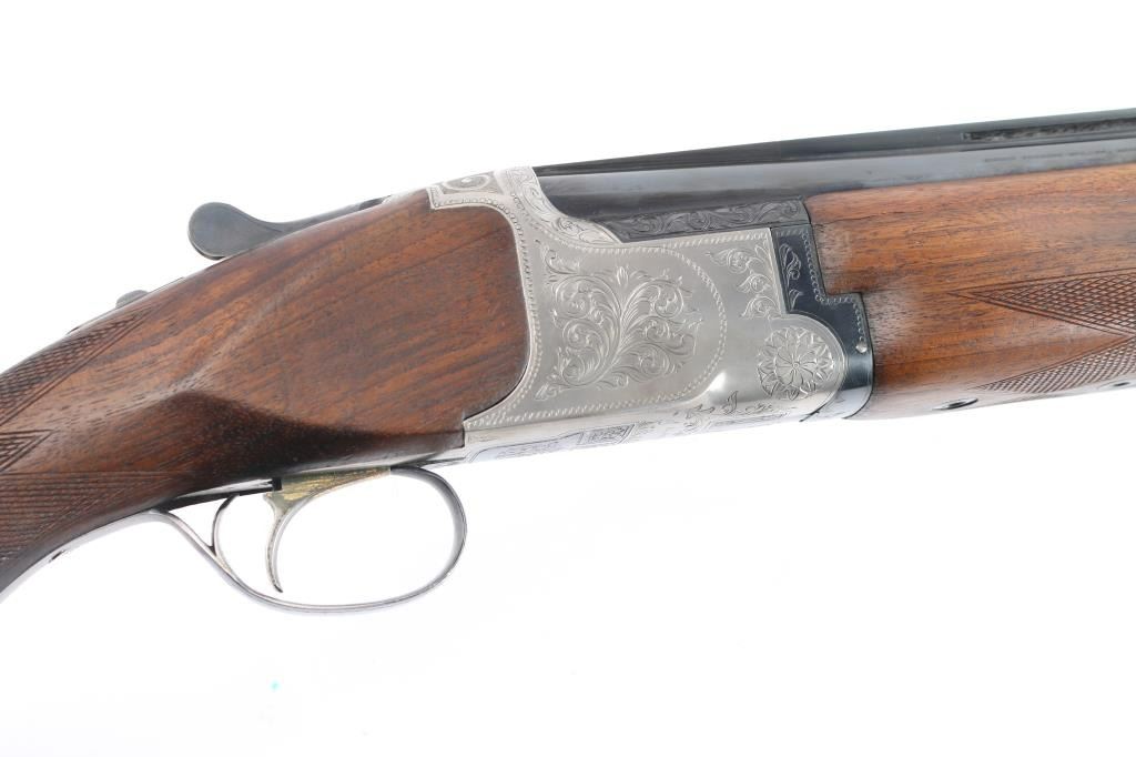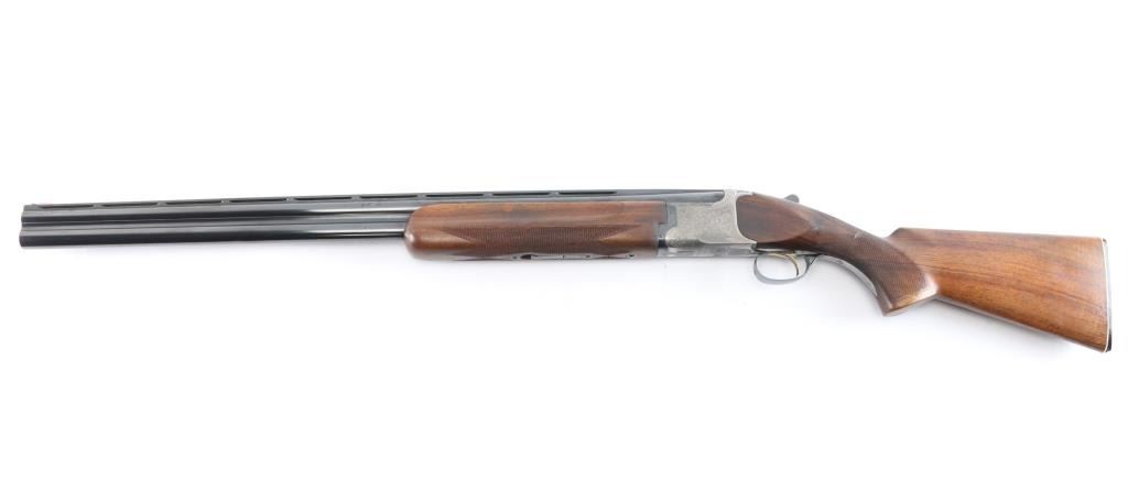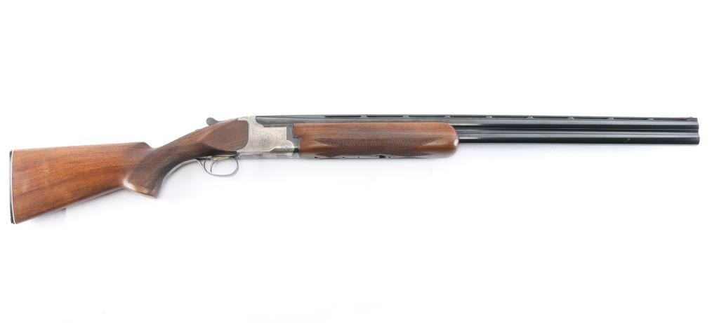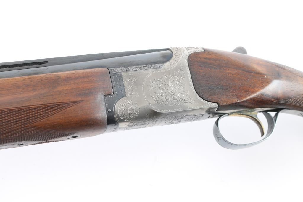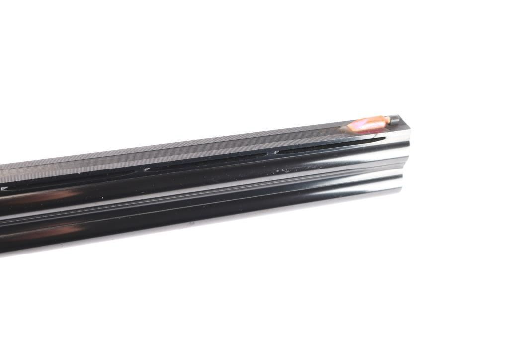 Miroku 800 SW (Skeet gun with wide rib) Over/Under Shotgun in 12 gauge, made B.C. Miroku in Kochi, Japan, 28" blued barrels, wide vented sighting rib with Bradley white bead. small white mid bead, chokes measure CLY over IC. coin finished receiver with foliate scroll and floral motifs,bordering, gold toned single, selective trigger, tang safety/barrel selector, auto extractors. Checkered wood stocks, semi beaver tail forearm, factory buttplate. LOP-13". Bores are excellent/bright, barrel lock-up tight, wood is very good/sound with minor scratches and a small dent in the left grip panel, receiver is excellent and the blue is about 94% with minor scratches, handling wear. A red fiber optic sight has been glued behind the front bead and the gold tone on the trigger is mostly gone from wear and there is a very small chip out of the buttplates toe. Consigner purchased this gun in Japan.