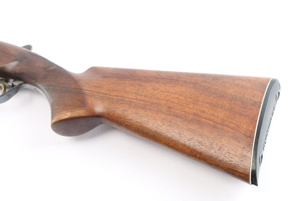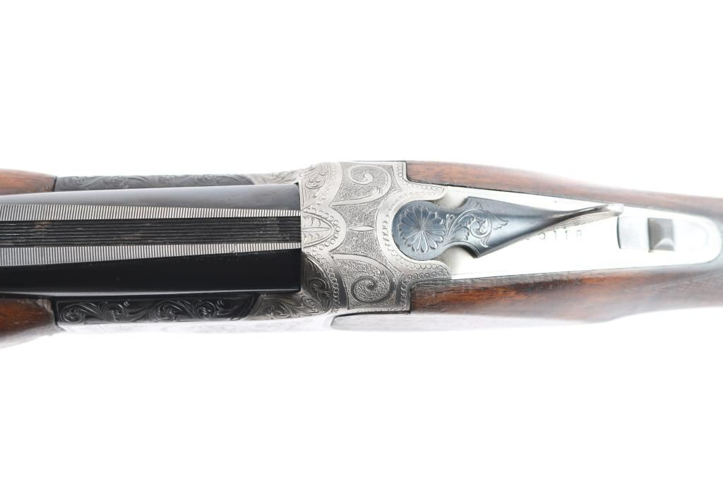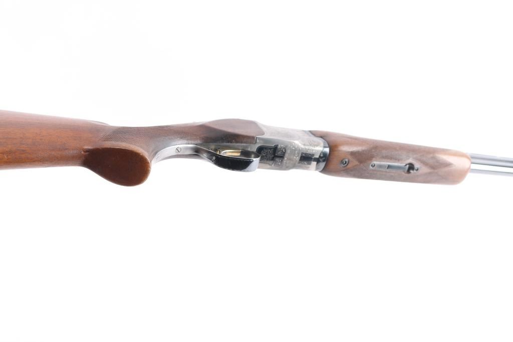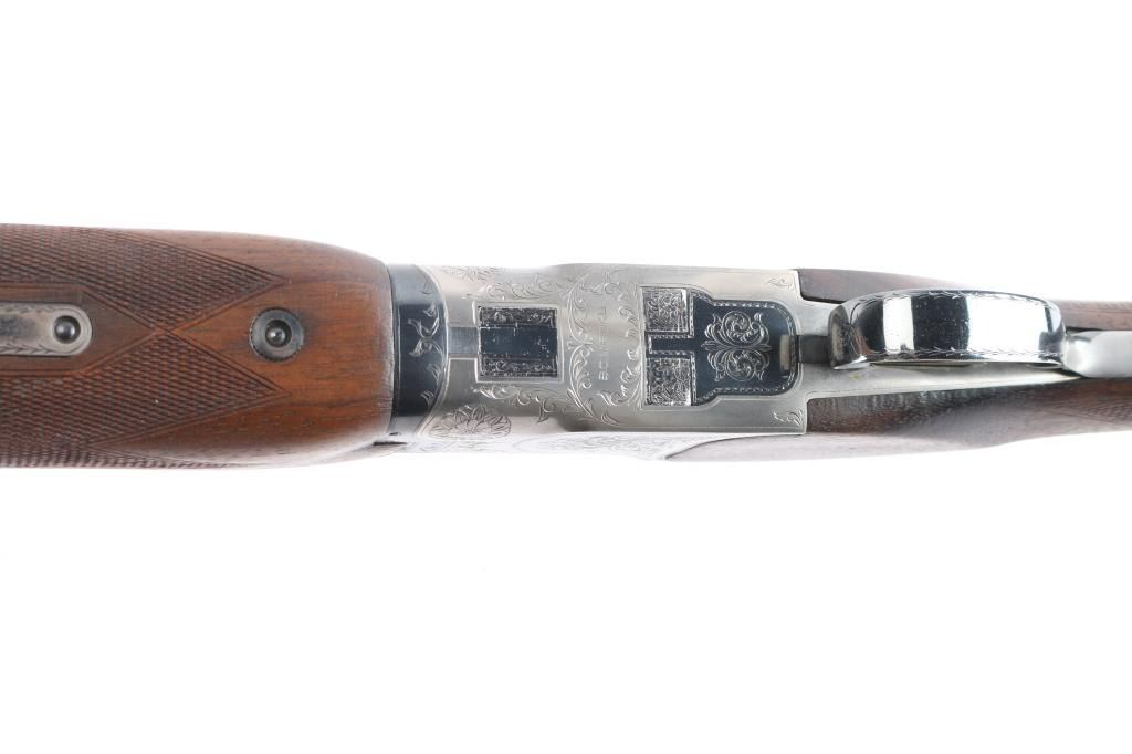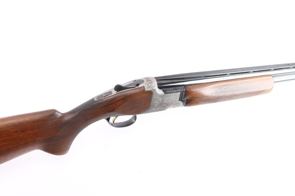 Miroku 800 SW (Skeet gun with wide rib) Over/Under Shotgun in 12 gauge, made B.C. Miroku in Kochi, Japan, 28" blued barrels, wide vented sighting rib with Bradley white bead. small white mid bead, chokes measure CLY over IC. coin finished receiver with foliate scroll and floral motifs,bordering, gold toned single, selective trigger, tang safety/barrel selector, auto extractors. Checkered wood stocks, semi beaver tail forearm, factory buttplate. LOP-13". Bores are excellent/bright, barrel lock-up tight, wood is very good/sound with minor scratches and a small dent in the left grip panel, receiver is excellent and the blue is about 94% with minor scratches, handling wear. A red fiber optic sight has been glued behind the front bead and the gold tone on the trigger is mostly gone from wear and there is a very small chip out of the buttplates toe. Consigner purchased this gun in Japan.