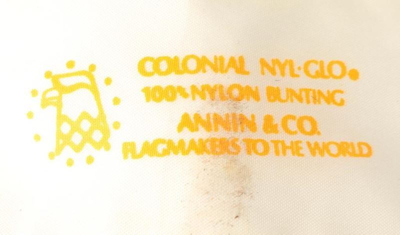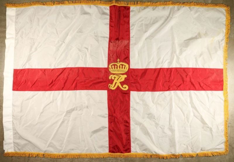 White nylon flag with red cross with a gold crown and 'RR' in the center trimmed in gold fringe. Measures 77" x 51" made by 'Colonial Nyl-Glo, 100% Nylon Bunting, Annin & Co. Glagmakers to the World". Good condition.