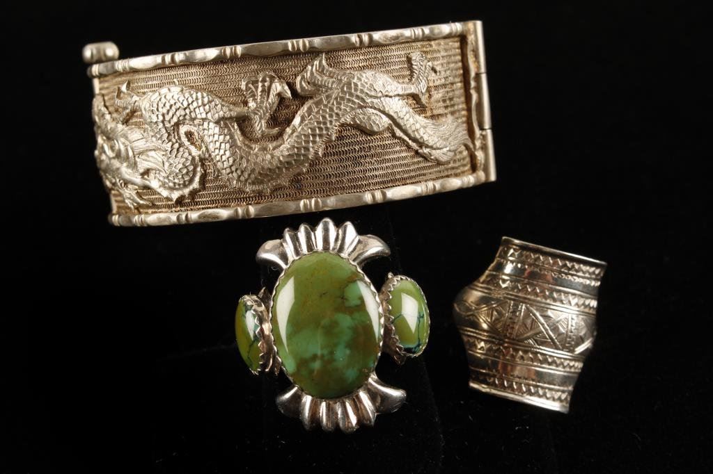 Misc. silver jewelry 1 sterling silver ring set with 3 malachite cabs. One silver ring with Indian motif. and a intricate Chinese silver bangle bracelet with dragon motif. Est:$250-300