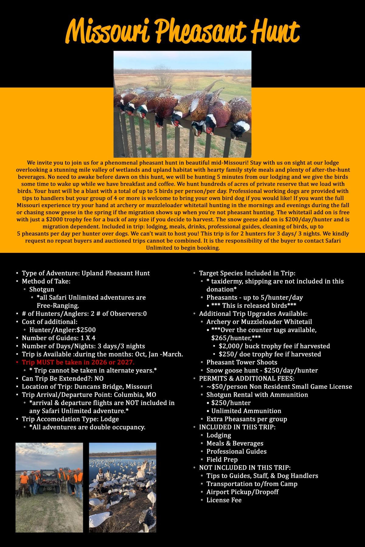 dependent. Included in trip: lodging, meals, drinks, professional guides, cleaning of birds, up to 5 pheasants per day per hunter over dogs. We can’t wait to host you! This trip is for 2 hunters for 3 days/ 3 nights. We kindly request no repeat buyers and auctioned trips cannot be combined. It is the responsibility of the buyer to contact Safari Unlimited to begin booking.