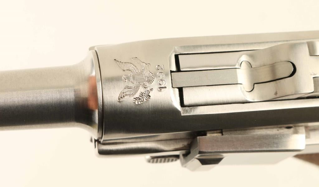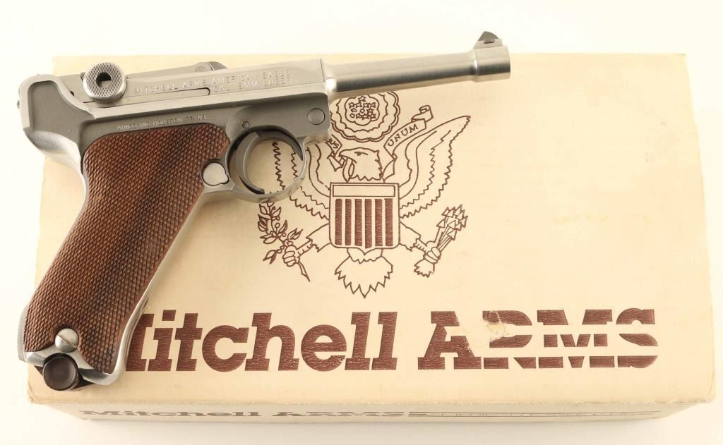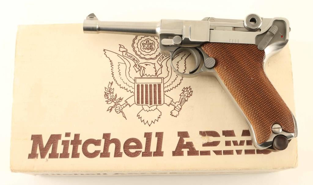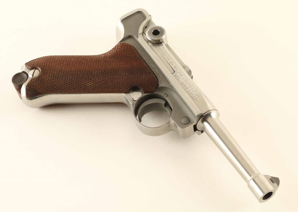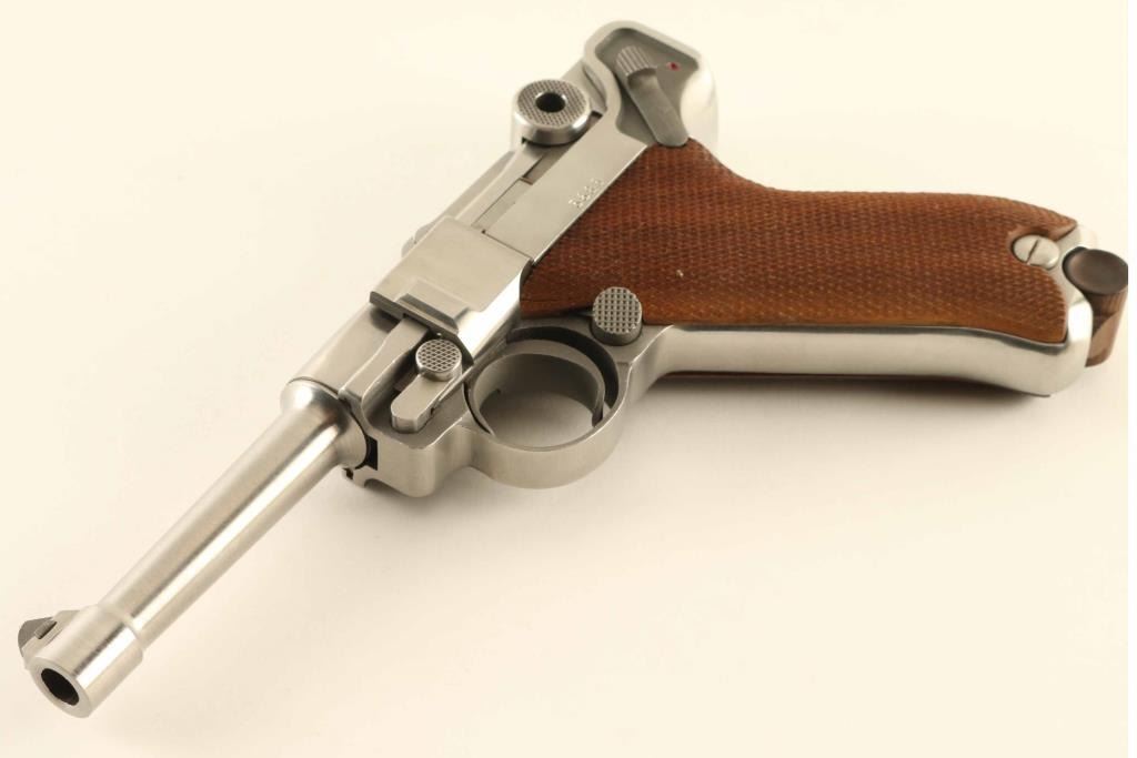 Close copy of Luger P08 Parabellum. Semiautomatic pistol features stainless steel construction, checkered wood grips, 4" barrel, fixed sights, manual safety. Condition is like new with few signs of handling, several bright rub spots on safety lever. Includes (1) magazine with wood base plug, maroon velvet cloth mag, manual, factory cardboard box. Condition is NRA Excellent *** Modern Firearm ***