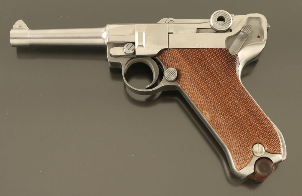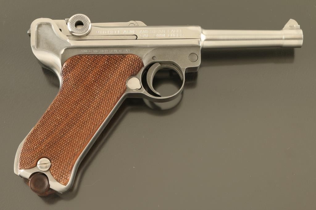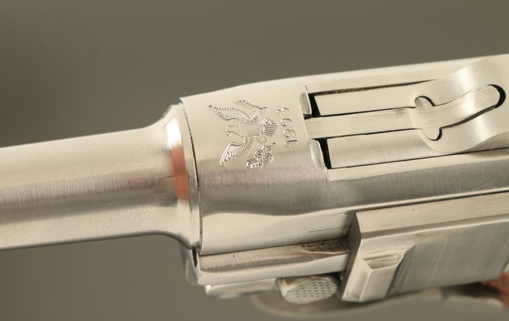 #3526 Semiautomatic pistol features stainless steel construction, checkered wood grips, 4" barrel, fixed sights, manual safety. Bore is excellent condition. Metal is very good or better condition with few observed scratches. Wood grips are very good with a few small gouges. American Eagle emblem over breech. Includes original box, manual and other paperwork, one magazine. Condition is NRA Very Good *** Modern Firearm ***