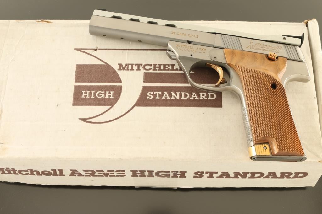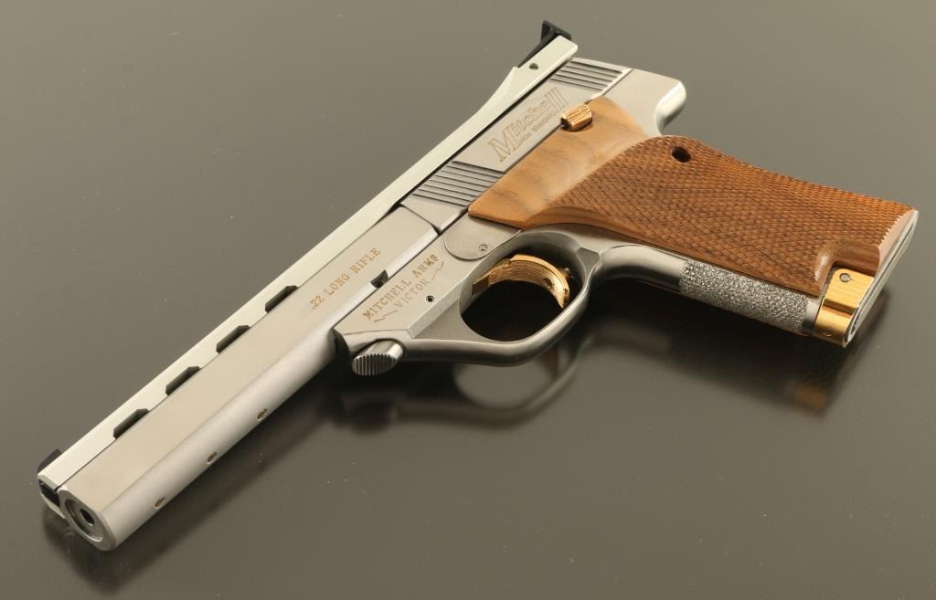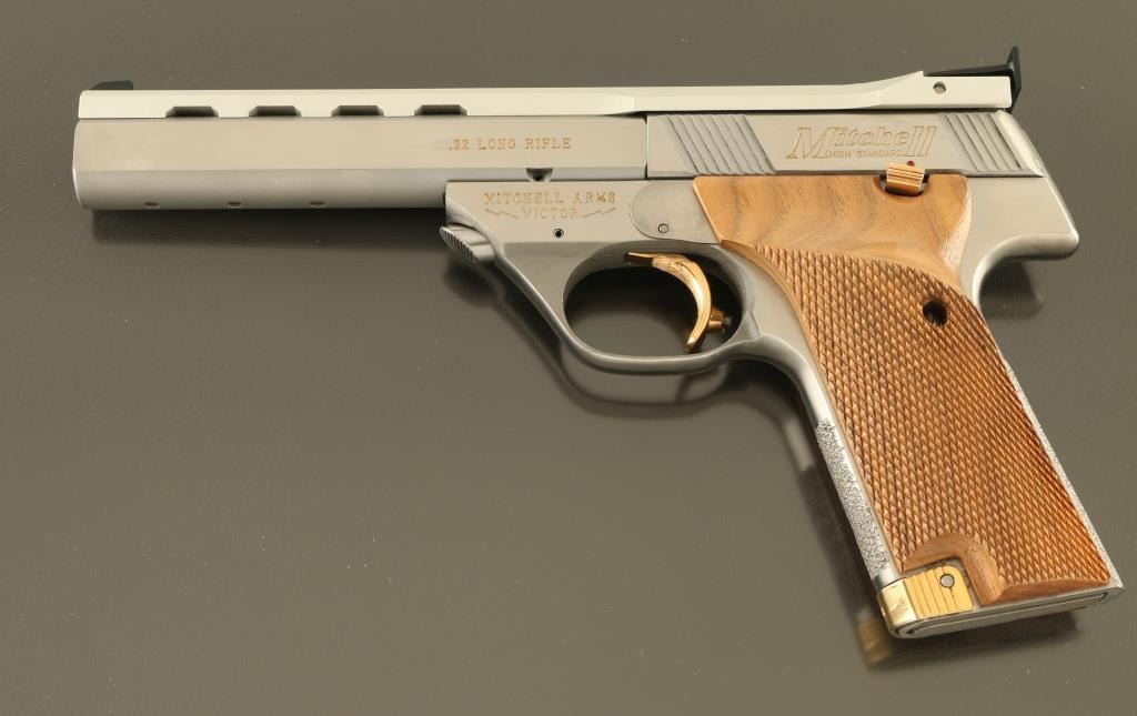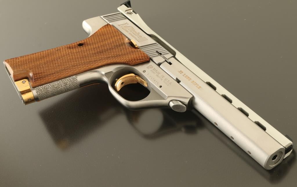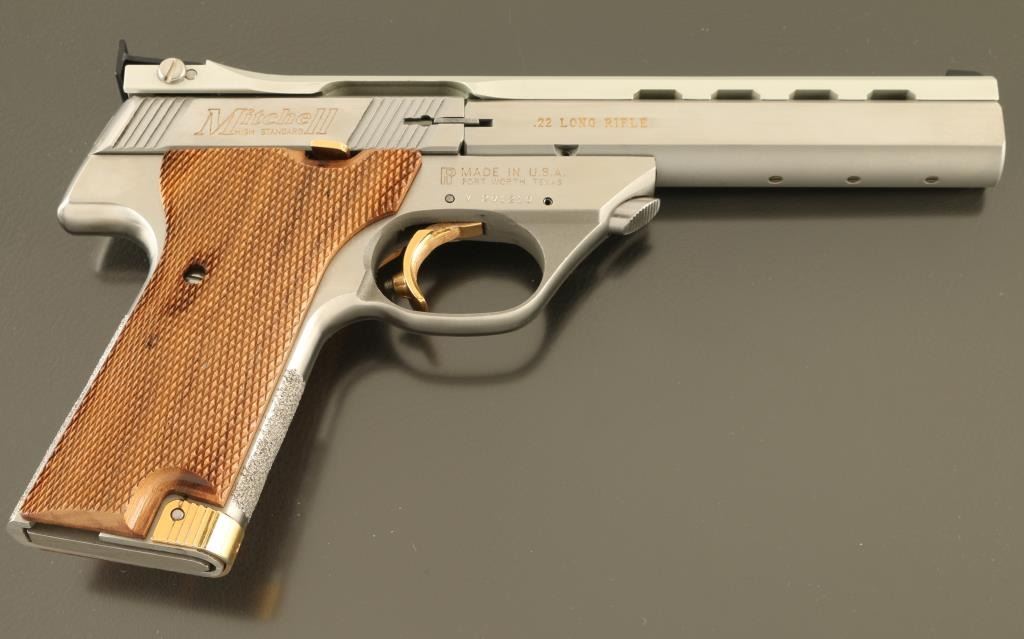 Semiautomatic rimfire pistol features stainless steel construction, gold color accents at operating controls, gold color infill of markings, checkered wood grips with right handed thumb rest, 5.5" heavy barrel (drilled & tapped underneath for mounting weights), adjustable sights, magazine release at front of butt, manual safety. Bore is excellent. Overall excellent external condition, with few signs of handling. Includes (1) magazine, factory box. Condition is NRA Excellent - like new *** Modern Firearm ***