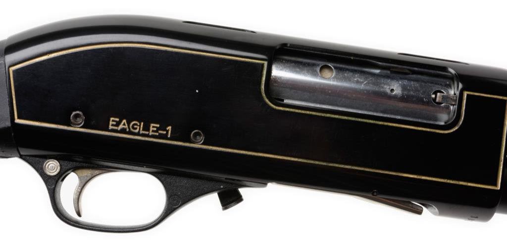 *Mitchell Escalade Model Eagle-1 pump action shotgun, 12 gauge, serial #38175. The shotgun is in overall very good condition with a 23” barrel with birdcage style muzzle break and rifle sights. The barrel and action retain nearly all of their black finish. The receiver is marked, “KARAELMAS, TURKEY.” The black synthetic s butt stock and fore end are in very good condition showing only minor handling marks. The buttstock ends with a rubber butt pad and 14 ¼” LOP. The bore is good, the action crisp and markings are sharp on this shotgun. Est.: $250-$400.