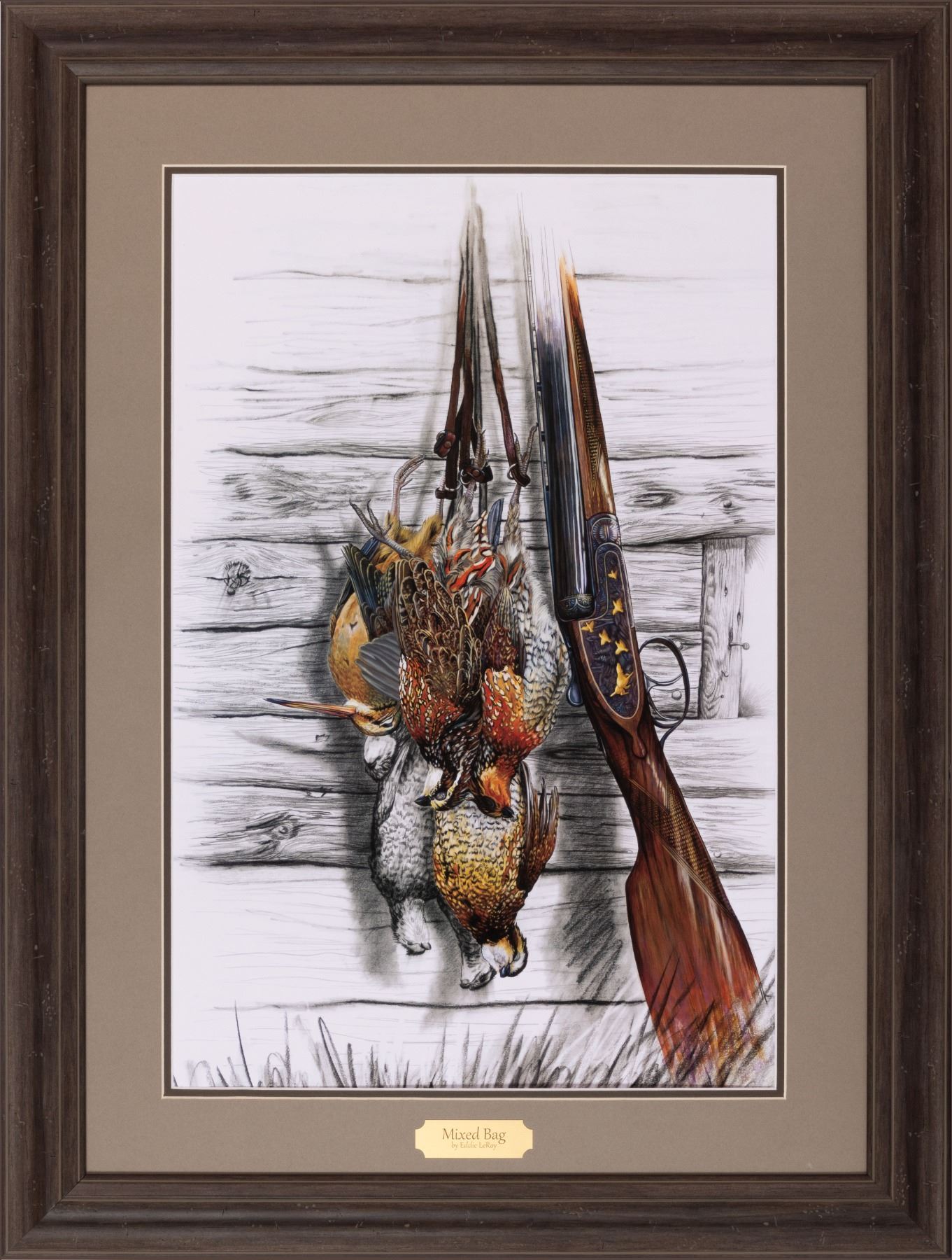 Eddie LeRoy's masterpiece, "Mixed Bag", unfolds a scene of triumph from a fruitful upland game hunt. The canvas is a testament to LeRoy's artistic prowess as he captures the diverse array of game secured during the expedition. Notably, LeRoy's accolades extend beyond this canvas, with victories in various stamp contests, including the prestigious 2020 Federal Duck Stamp. His artistry, a reflection of his life's journey, resonates with personal experiences and adventures. In "Mixed Bag," LeRoy skillfully intertwines the thrill of the hunt with his profound artistic narrative, inviting viewers to share in his cherished moments of life and nature's beauty.