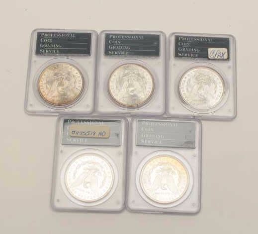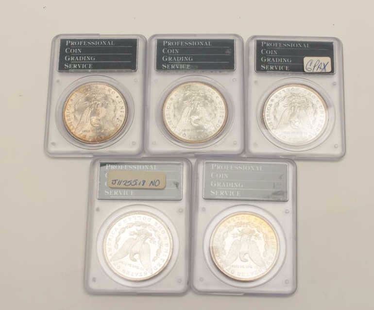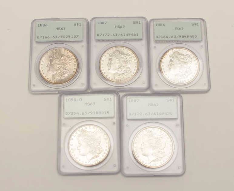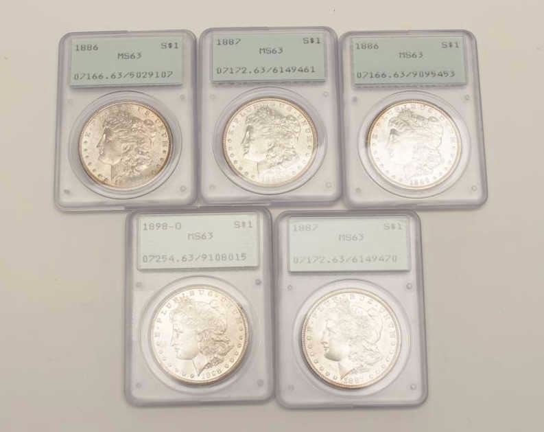 Mixed Lot of 5 MS-63 Dollars, P.C.G.S. graded 1889-0, 1886, 1886, 1887, 1887. Est$275-550