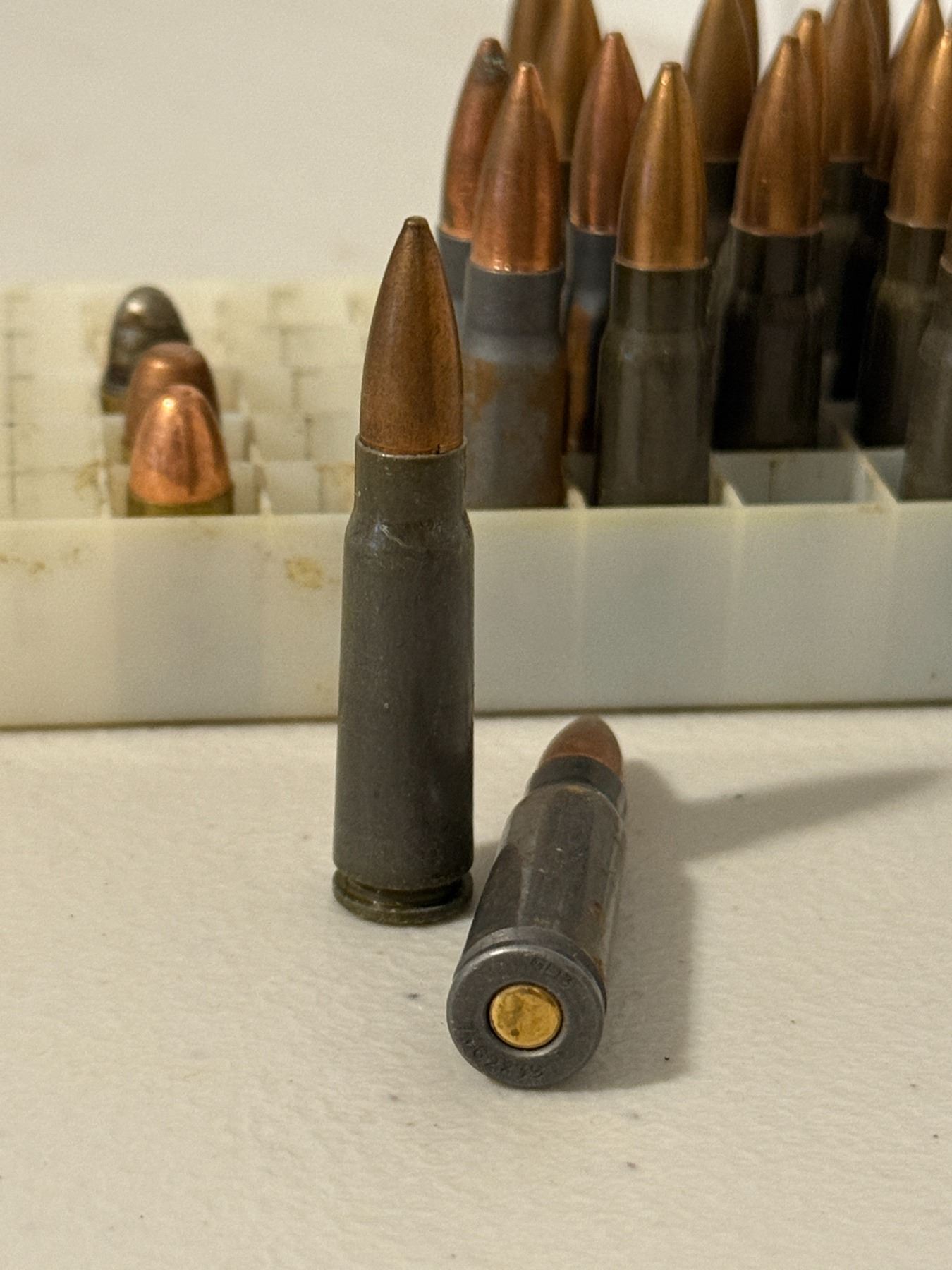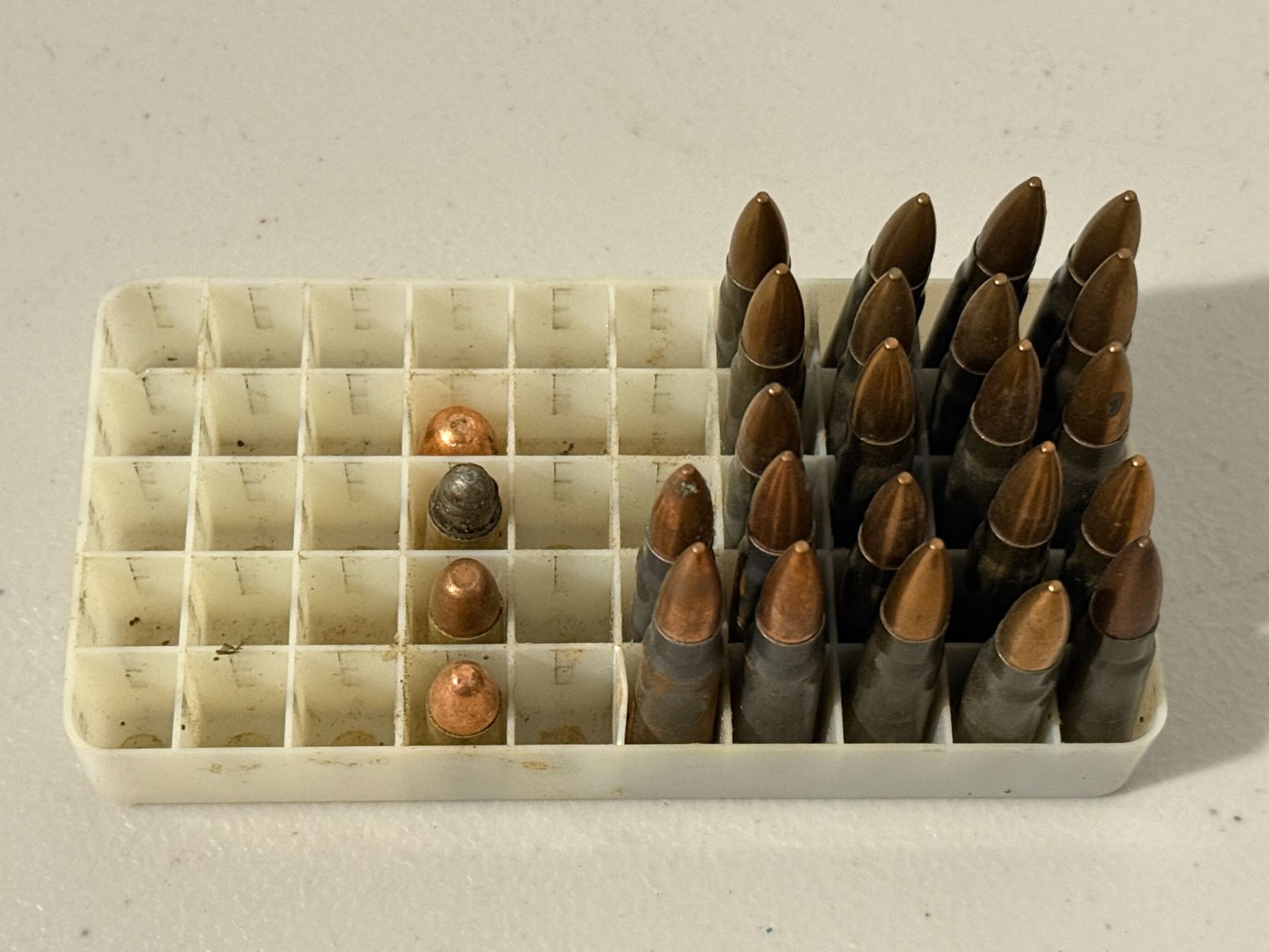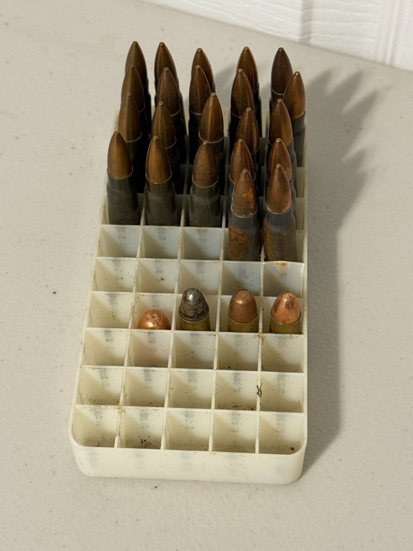 Lot of approximately 20–25 rifle cartridges in plastic tray. Mixed condition. Caliber unspecified. As pictured. Possible reload. Sold as-is.
