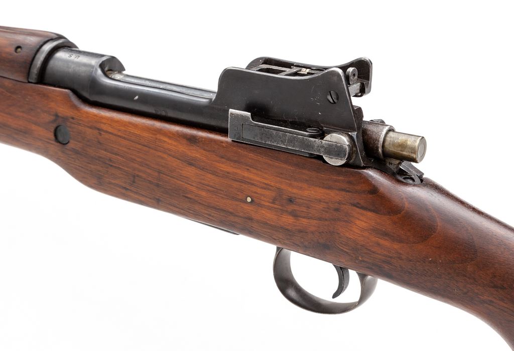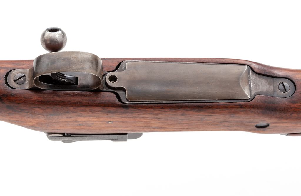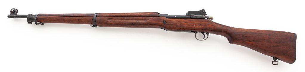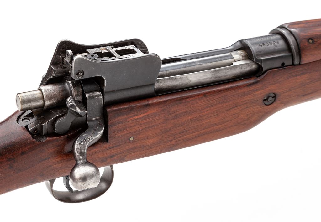 U.S. Model 1917 Enfield Bolt Action Rifle, by Winchester, #483929, .30-06 cal., 24'' barrel, blued finish, walnut stock, blade front sight with protective ears and adjustable folding leaf rear sight. Stamped on receiver ring ''U.S. MODEL OF 1917 WINCHESTER''. Winchester barrel is dated 1-18. Mismatched bolt is of Winchester mfg. with Eddystone stock. Left side of barrel is import marked. Condition overall is very good with approx. 80% finish remaining; triggerguard and floorplate with little remaining finish. Wood has been sanded relatively smooth and refinished with a flat oil type finish. Action is smooth, bore is very good with sharp rifling. Est.: $400-$600. (C&R)