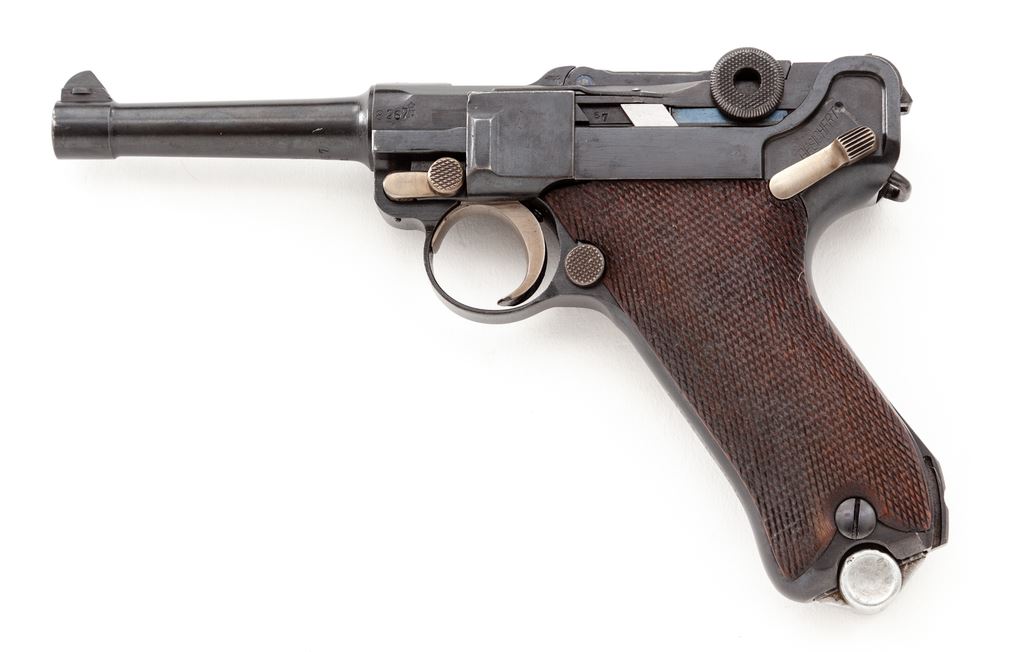 Model 1920 Police Re-Issue Luger, by DWM, #8267m, 9mm, 4'' barrel, blue finish, straw small parts, checkered walnut grips, with mismatched blue-bodied aluminum based magazine. Chamber area hand stamped 1920, DWM marked toggle, Geischert/Geladen safety and extractor, with ''(crown)/N'' proofmarks to barrel, upper receiver, and forward toggle link. All visible matching numbers. Front strap ''L.P.Th.Nr.213'' indicating use by the Landes Polizei. Condition is excellent as arsenal refinished, retaining approx. 97% blue. Grips with even general flattening and some small impressions. Good action, fine bore. Est.: $750-$1,000. (C&R)