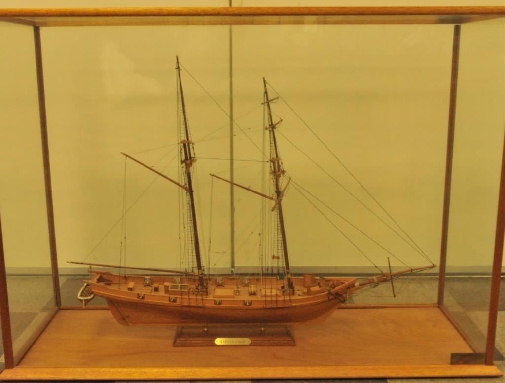 Model of 8 gun brigantine (1847) “Harvey”. Museum quality model. Classic plank with natural wood finish in display case. The case measures 44” x 15” and the model measures approximately 36” x 30” in height. Est.:$600-$1200