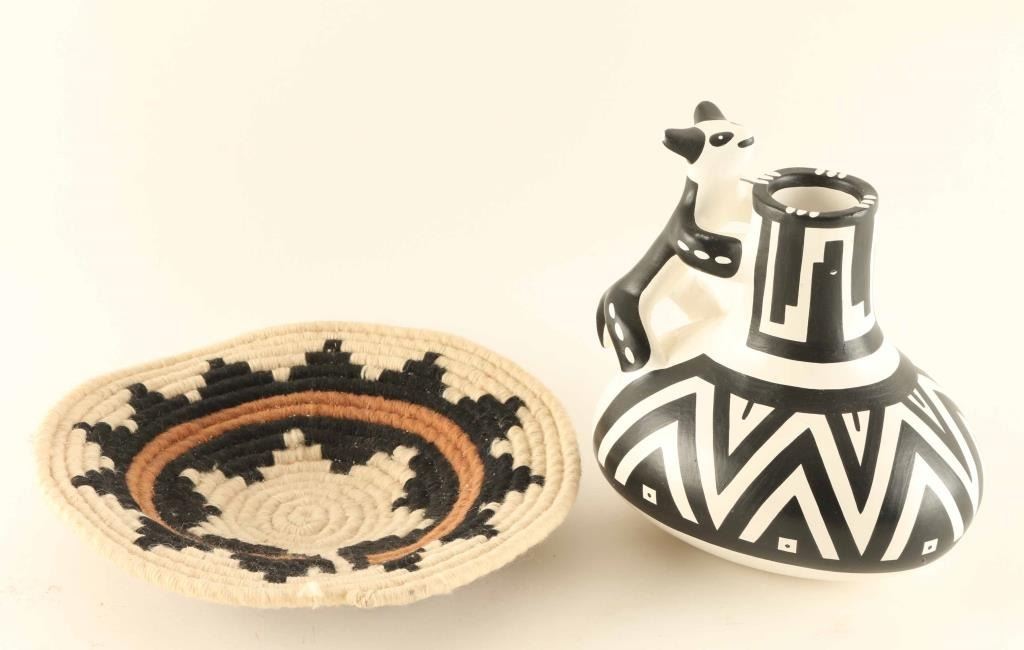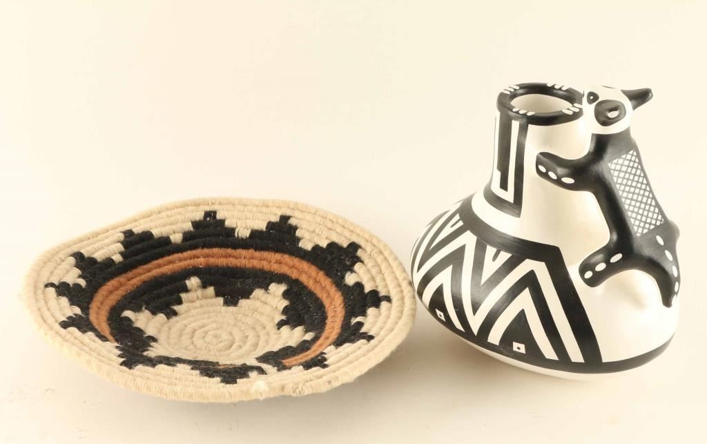 Long Grass signed vase with animal effigy 6"x6" and a basket.