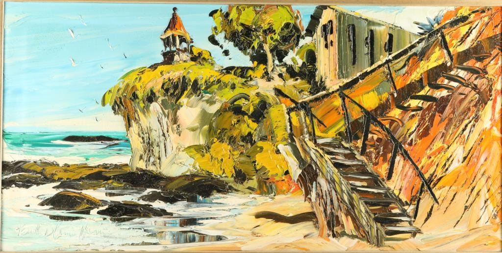 Modernist original oil on canvas of sea shore by noted southern California artist Paul Blaine Henrie (Signed). Measures approximately 17 ½” x 35 ½”. This artist was one of the top recognized in art shows in the 1970s until an unfortunatemisadventure. Est.: $300-$600