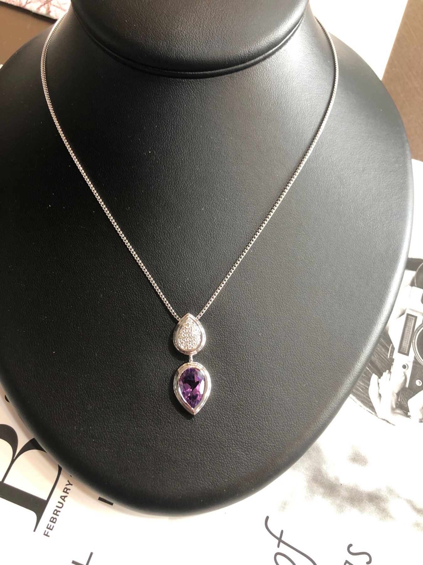 Full Description: Montague’s Jewelers has graciously partnered with the Montana Safari Club to offer this exquisite women’s necklace by “John Atencio.” Lilac Amethyst and .25 tx diamonds,14 karat white gold with box wheat 14K white gold chain. Make the lady in your life smile!