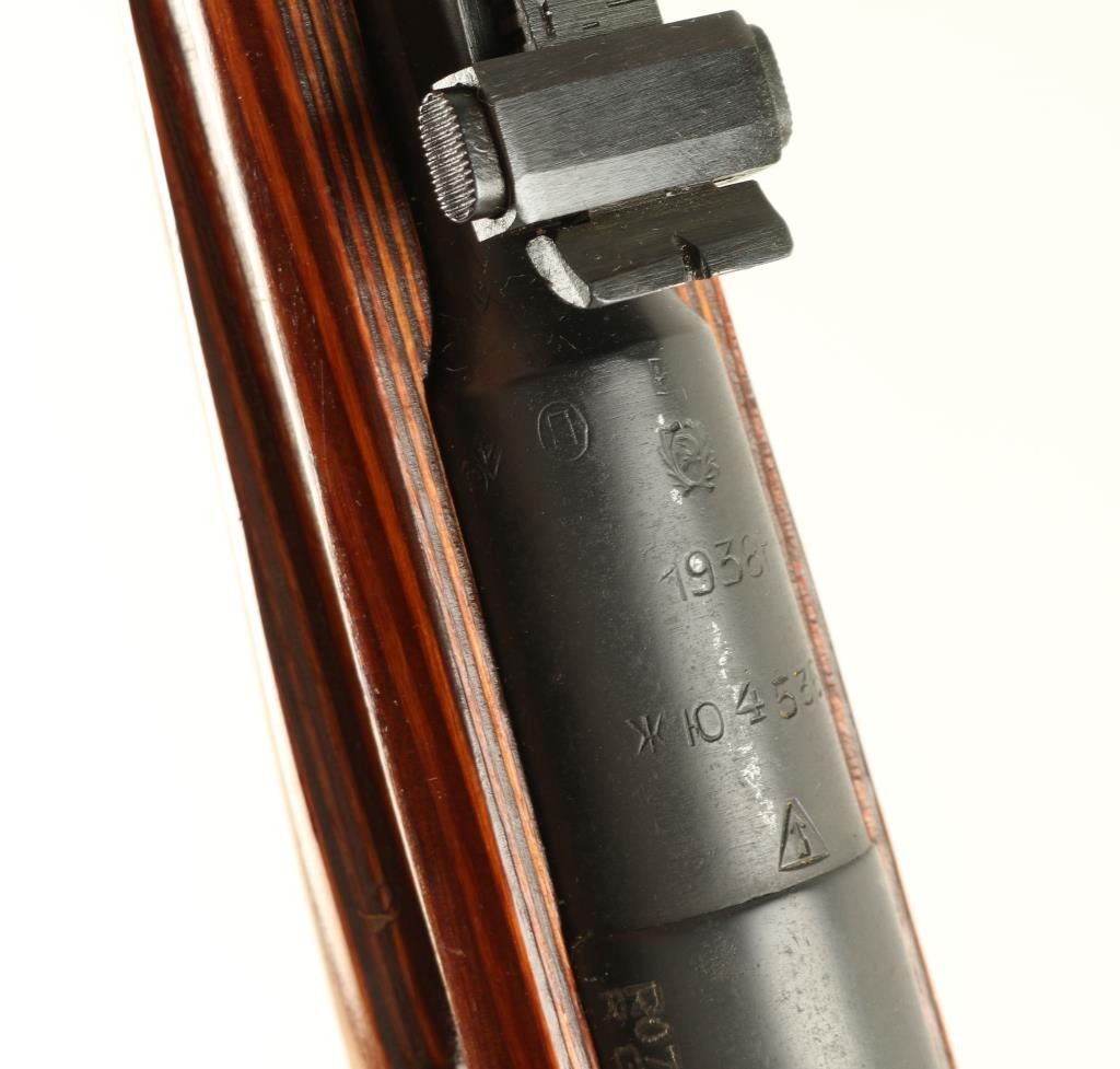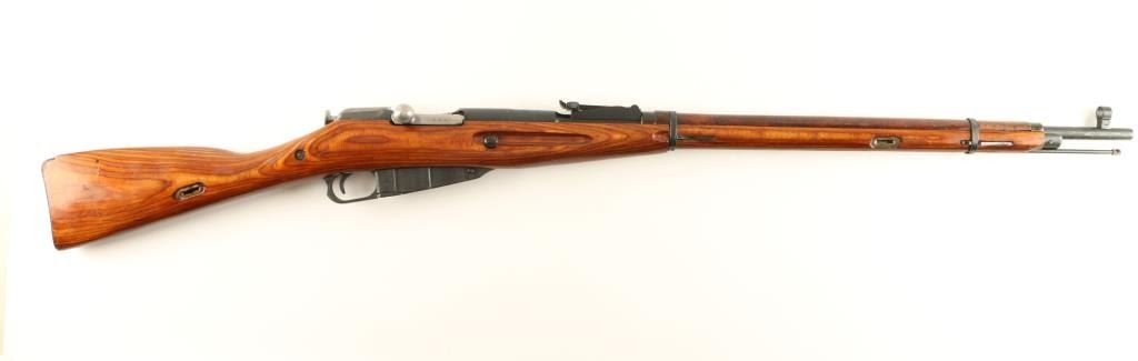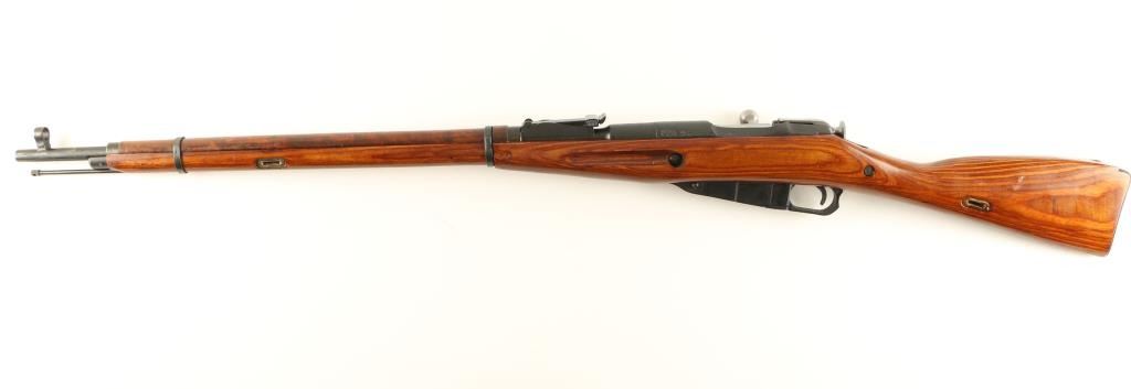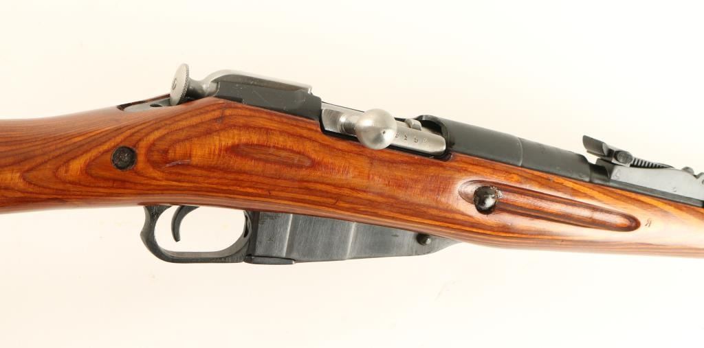 Russian military bolt action service rifle chambered in 7.62x54Rmm, circa 1938. Featured a blued finish, Izhevsk marked 28.7" tapered barrel, hooded post front sight, graduated rear sight to 2,000 meters, cleaning rod, internal box magazine, straight bolt handle, two barrel bands, smooth wood handguard and laminated wood straight grip shoulder stock with metal buttplate. Non-matching serial numbers and import marks on receiver. Finish is approximately 90% intact with little wear. Action functions well, bore is dark with good rifling and shoulder stock is very good. Condition is good. ***C&R Firearm*** ***Modern Firearm***