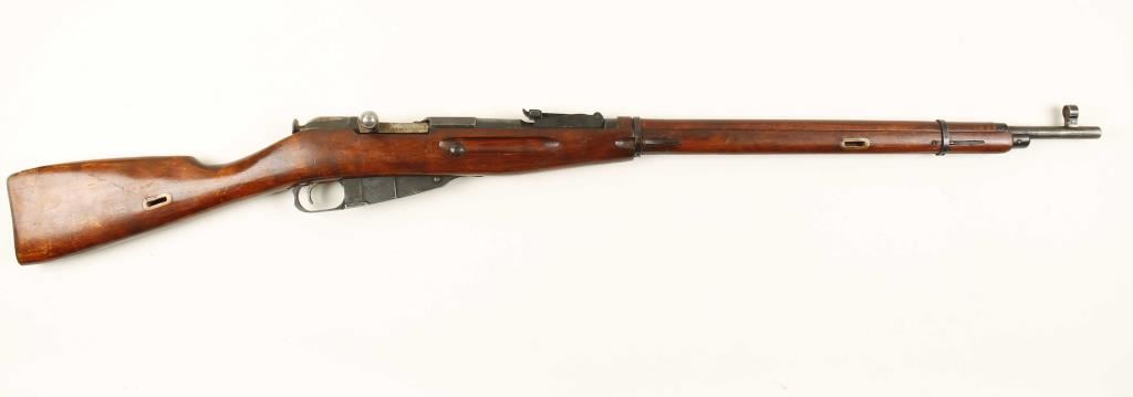 Blued Russian bolt-action rifle with a29" barrel stamped 1930 and marked with the Tula arsenal arrow. Has hex receiver. Bolt, barrel and receiver have matching serial numbers. Import marked. Bluing is worn with edge wear. Wood has a replacement chip at the heel of the butt. It also has dings and scratches in the finish. There are cartouches near the top tang of the butt plate. Stock is a poor fit to the receiver. No cleaning rod. Bore has wear but is shiny with strong rifling. Action is sticky but works well. Condition is good.