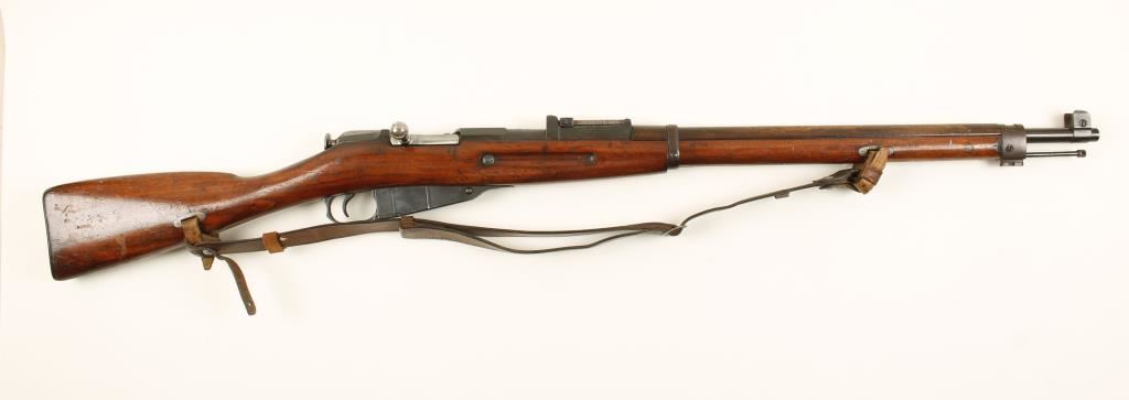 Russian military blued bolt-action rifle with a 27" barrel and a leather sling. Receiver is stamped "SK.Y 1940". Serial numbers do not match. Import marked. Bluing is very good with the barrel bands turning to plum. Bolt has pitting. Butt plate has surface rust. Stock has a crack at the upper tang and the usual array of dings and dents. Bore is frosty with rifling. Action is fine. Condition is fair to good.