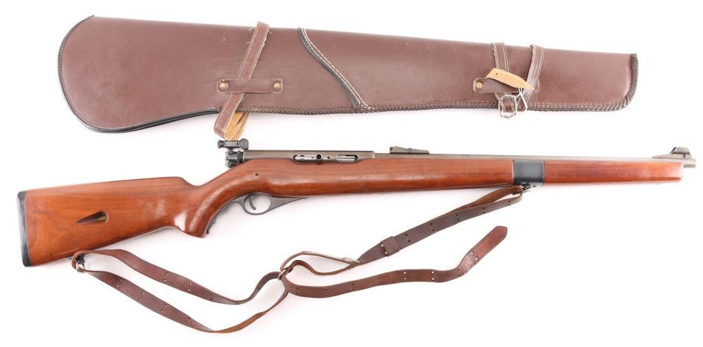 Vintage semiautomatic rimfire rifle circa 1947-58. Features a 20" barrel, a wood full length Mannlicher stock (with metal insert piece mid-forend), front sight base with removable hood and multiple flip circle or posts, tangent notched rear sight on barrel, tube magazine in buttstock, black plastic trigger guard with curved finger groove extension on wrist, plastic buttplate, sockets for twist-lock swivels. Mossberg S-130 peep sight mounted on left side of receiver. Manual safety involves drawing bolt slightly to rear and pushing bolt knob inward. Bore is very good and bright. Retains less than 10% finish with light brown patina. Wood is in good condition, with scrapes and scratches. Missing a portion of the plastic butt cap on heel of stock and broken sling swivel lever. Comes with brown leather sling and brown scabbard.