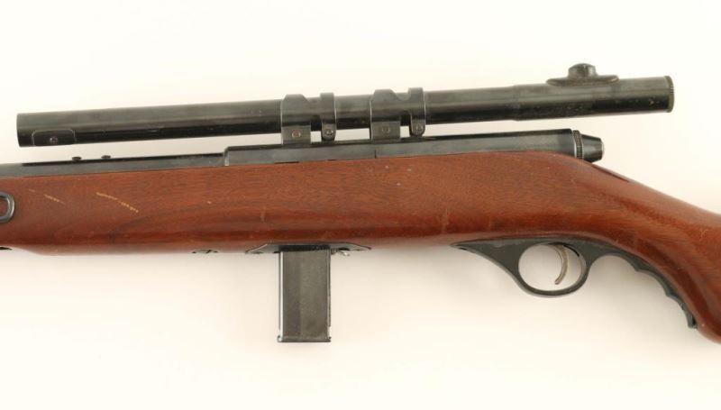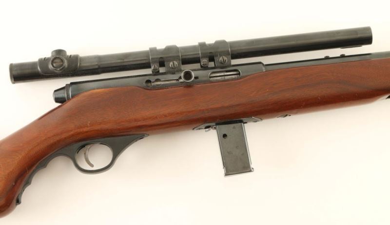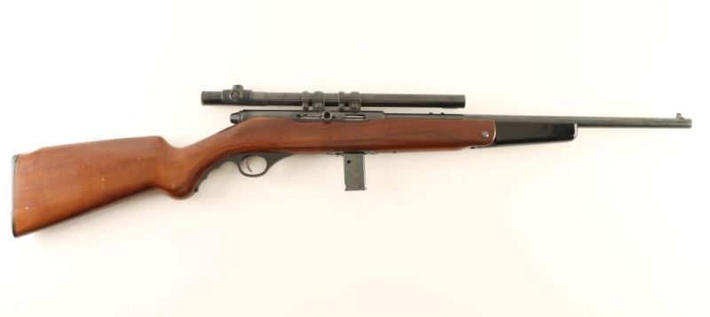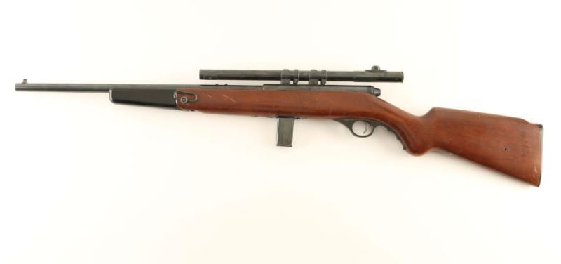 Vintage American made semi-automatic sporting rifle chambered in .22 Long Rifle, manufactured pre-1968. Features a blued finish, 18.25" barrel, dovetailed blade front sight, removed rear sight, Mossberg M4D 4x scope, flip-down vertical foregrip, 11 round detachable magazines, cylindrical charging handle the pushes in the holes in the receiver for safe & hold open positions, smooth trigger, plastic trigger guard and smooth wood pistol grip shoulder stock with serrated black hard rubber buttplate. Rifle retains approximately 85% of it's original finish showing mild wear and a concentration of scattered rust on the right side of the barrel between the front sight and the forend. Action performs well, bore is very good and the wood stock is good+. Condition is NRA good. ***C&R Firearm***