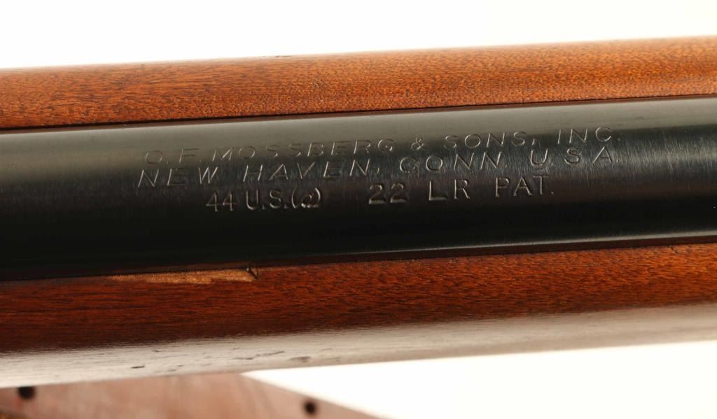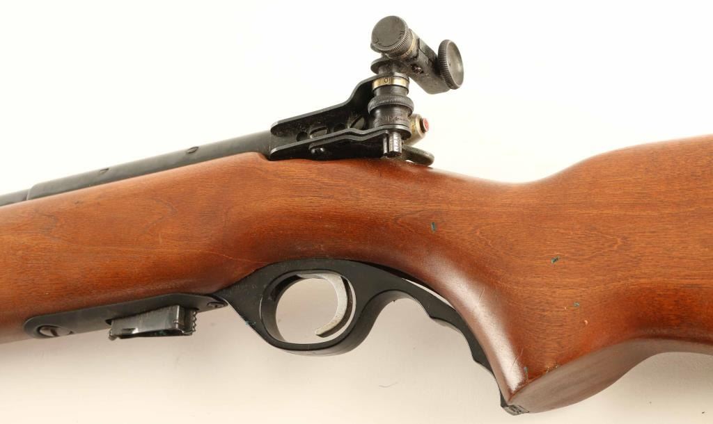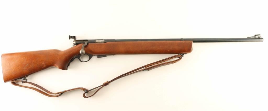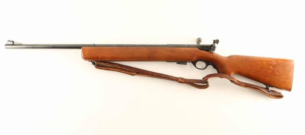 Bolt action rimfire rifle features blued finish, wood stock, 26" barrel, target sights with adjustable rear peep, sling swivels, flat steel buttplate, manual safety, takes detachable magazine. Bore is very good. Metal retains 80% dark blue finish with some bare metal on sharp edges, beginning to form patina on several spots along barrel. Wood is very good condition with shallow scrapes and scratches, mostly at butt. Includes one magazine and a fair condition leather target type sling. Condition is NRA Very Good *** C&R Firearm ***