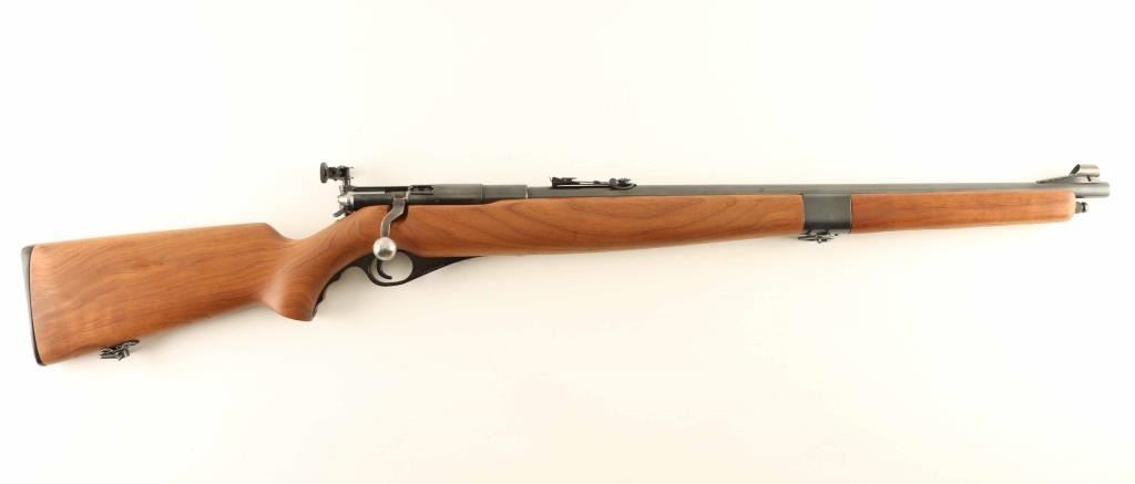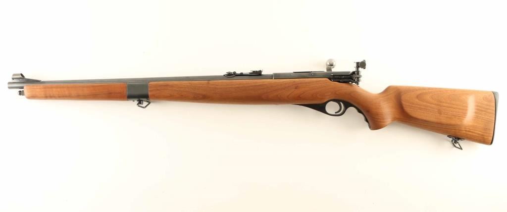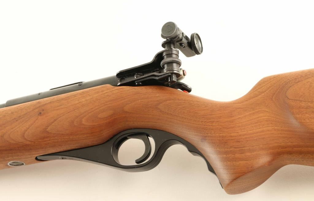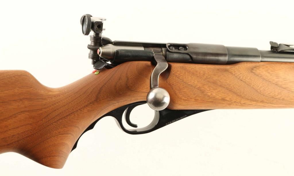 Bolt action rimfire rifle features blued finish, full length wood stock, 23" barrel, full length tube magazine under barrel, hooded front sight with open circle style insert, adjustable rear sight on barrel, adjustable diopter sight mounted at receiver, manual safety, sling swivels. Bore is excellent. Overall condition is Excellent with few signs of use or handling. Condition is NRA Excellent *** C&R Firearm ***
