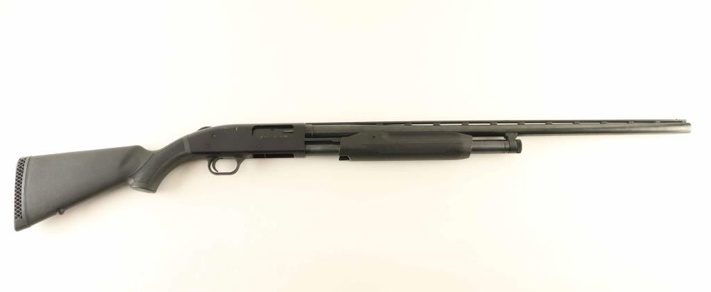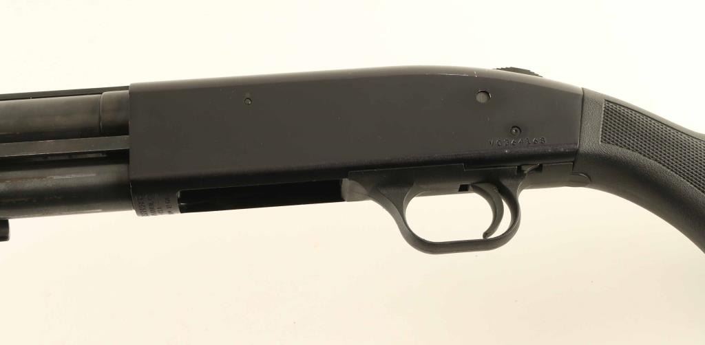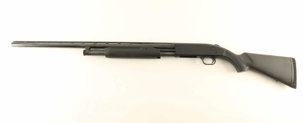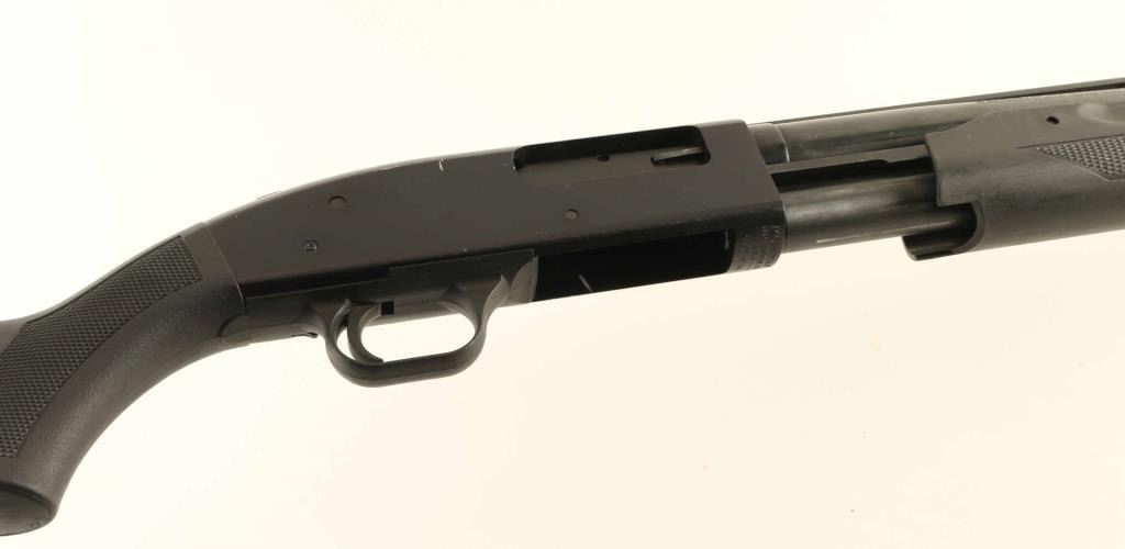 Pump action shotgun features blued finish, black polymer stock & pump handle with checkered panels, ventilated rubber recoil pad, 28" ventilated rib barrel, fixed MOD choke, black post front bead & small brass mid bead, manual safety, magazine tube under barrel. Accepts up to 3" shells. Bore is good condition, bright and smooth, vent rib post weld locations visible inside bore. Retains 85% finish with scratches & scrapes, some patina on mag tube. Polymer furniture is very good condition. Condition is NRA Very Good *** Modern Firearm ***