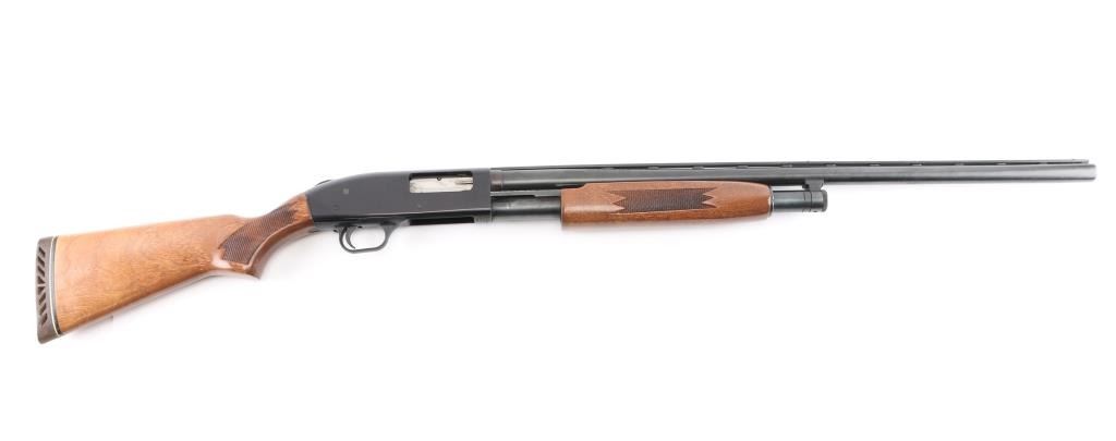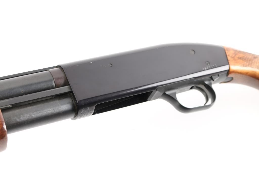 Pump action 12 Gauge shotgun chambered for 2 3/4" and 3" shells. Features a 28" blued finish serrated vent ribbed barrel with a white bead front and small brass bead mid-barrel sights. Checkered wood slide forearm and shoulder stock with a vented soft rubber buttpad. Smooth curved trigger and tang slide safety. LOP is 14". Retains approximately 80% finish with a few minor scratches on top of receiver and very light pitting under the barrel. Wood stock and forearm are very good with little to no scratches. Worn surfaces on magazine tube and action bars. Bore is clean and shiny. Action is smooth. Comes with a FULL choke tube installed.