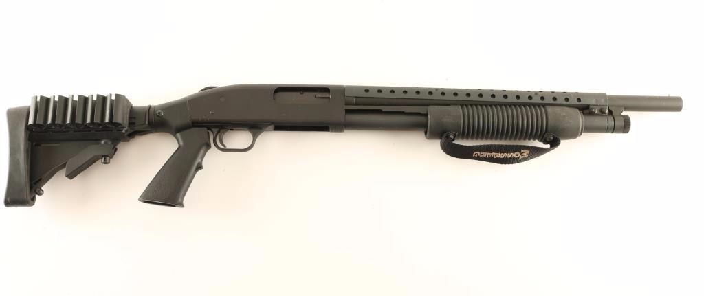 American made slide-action tactical shotgun chambered for 2 3/4" or 3" 12 gauge shells. Features a matte black finish, 18 1/2" cylinder bore barrel, brass bead front sight, ventilated metal barrel shroud, 7/8 length tube magazine, drilled & tapped alloy receiver, sliding safety, smooth trigger, grooved black synthetic slide handle with nylon strap and ATI pistol grip stock with telescoping 6-position butt stock, recoil pad & 5 slot shell holder. Shotgun exhibits approximately 95% of it's original finish showing slide wear on the magazine tube and scattered handling marks/scuffs. Action is smooth, bore is excellent and synthetic stocks are fine. Condition is very good+++. ***Modern Firearm***