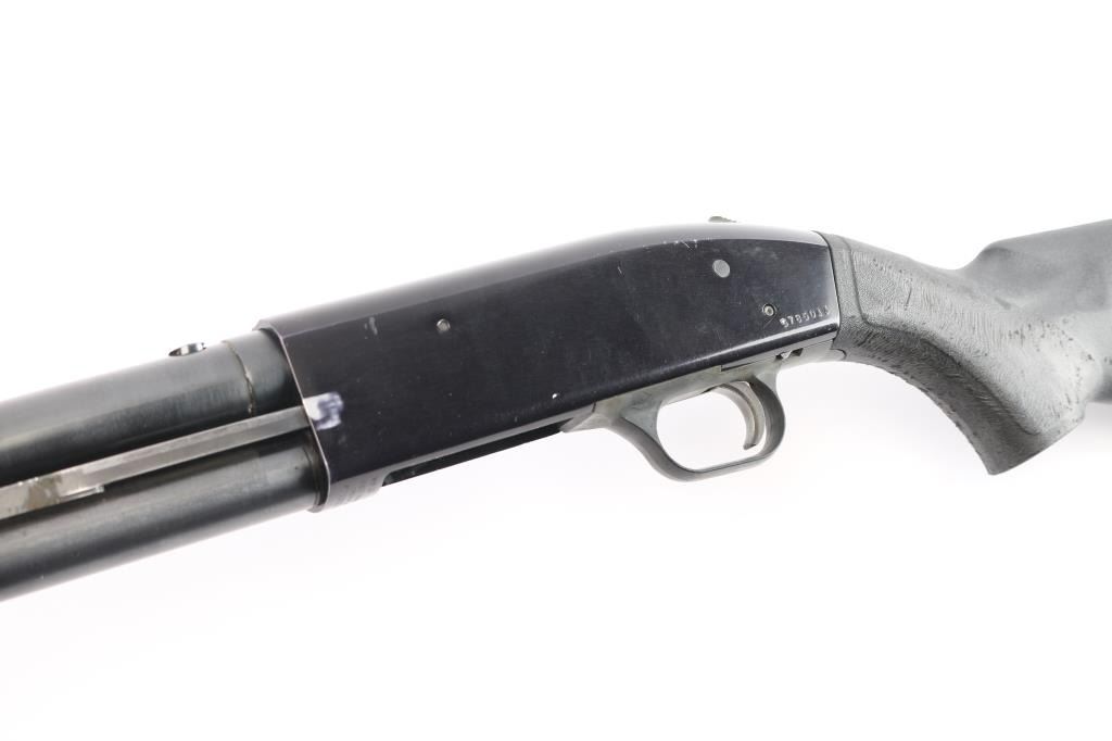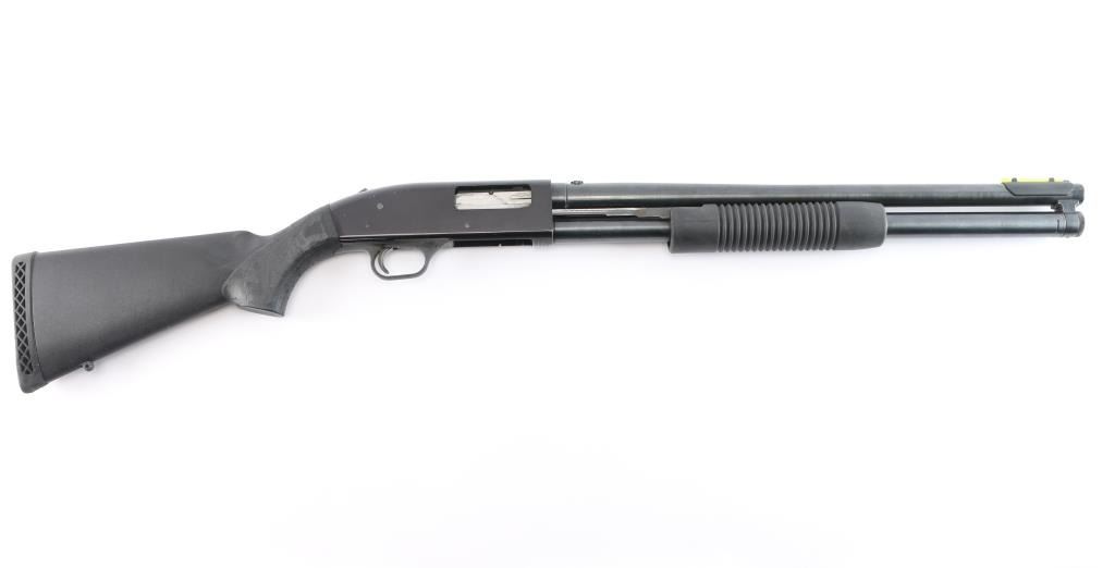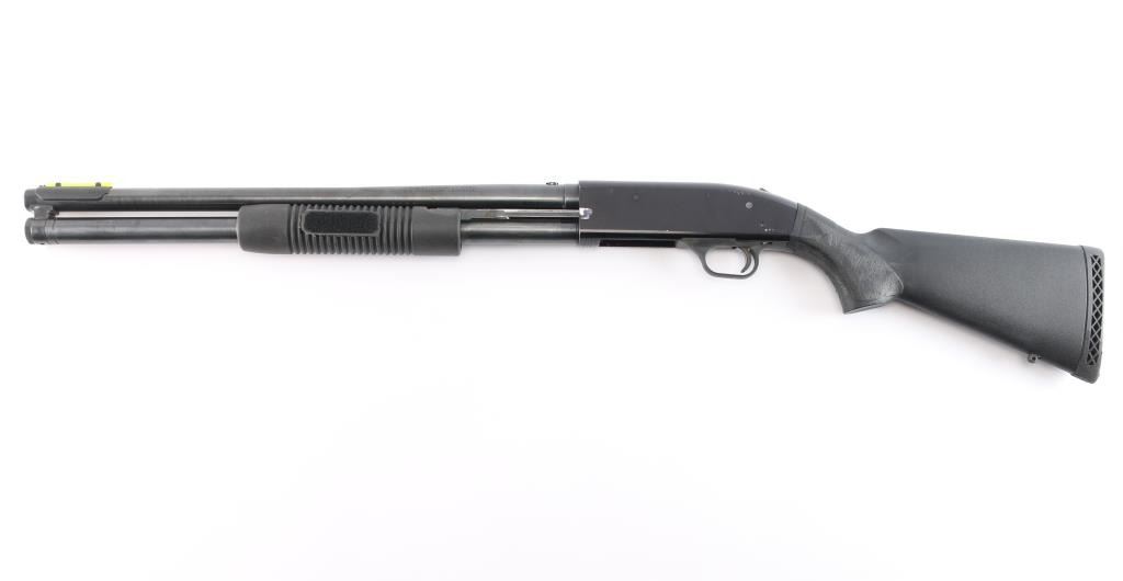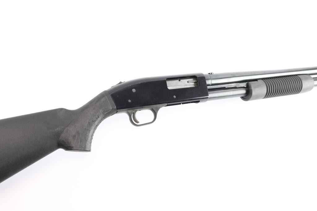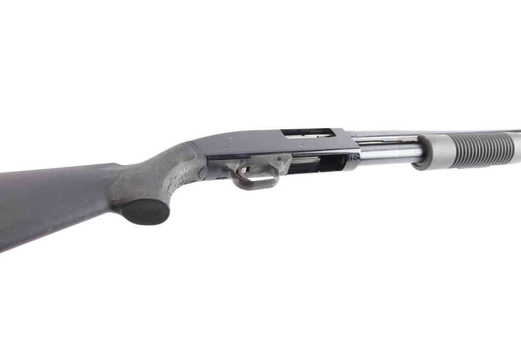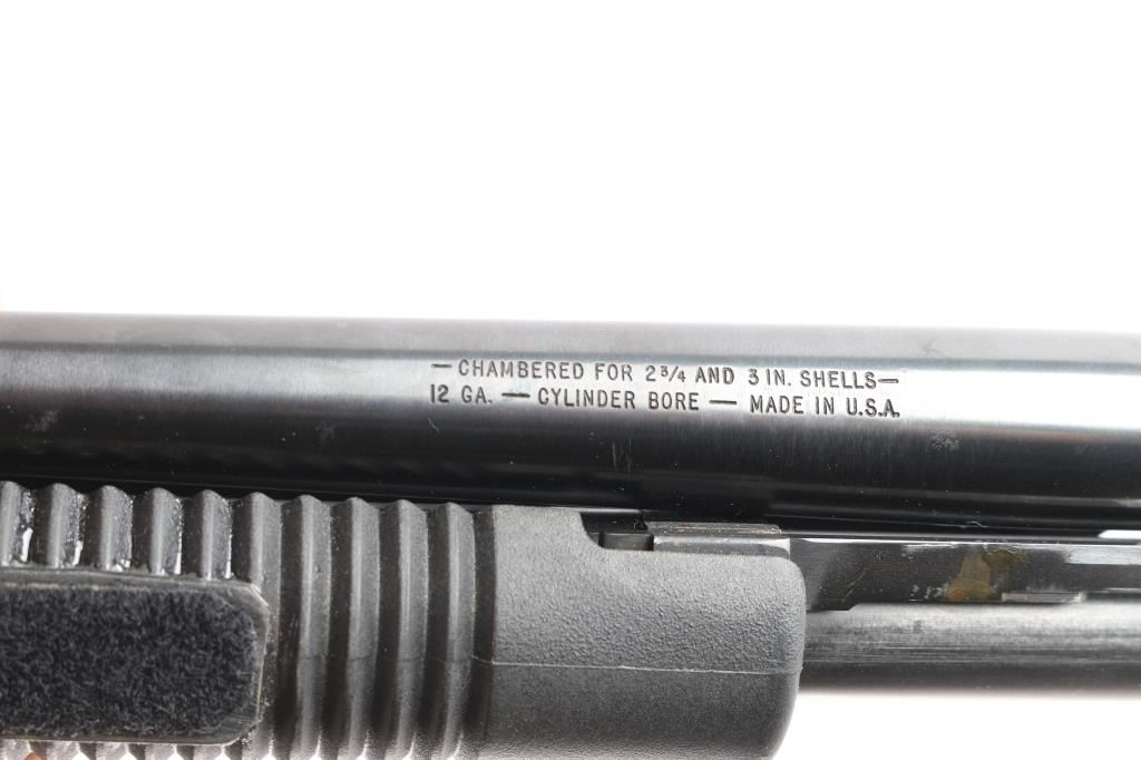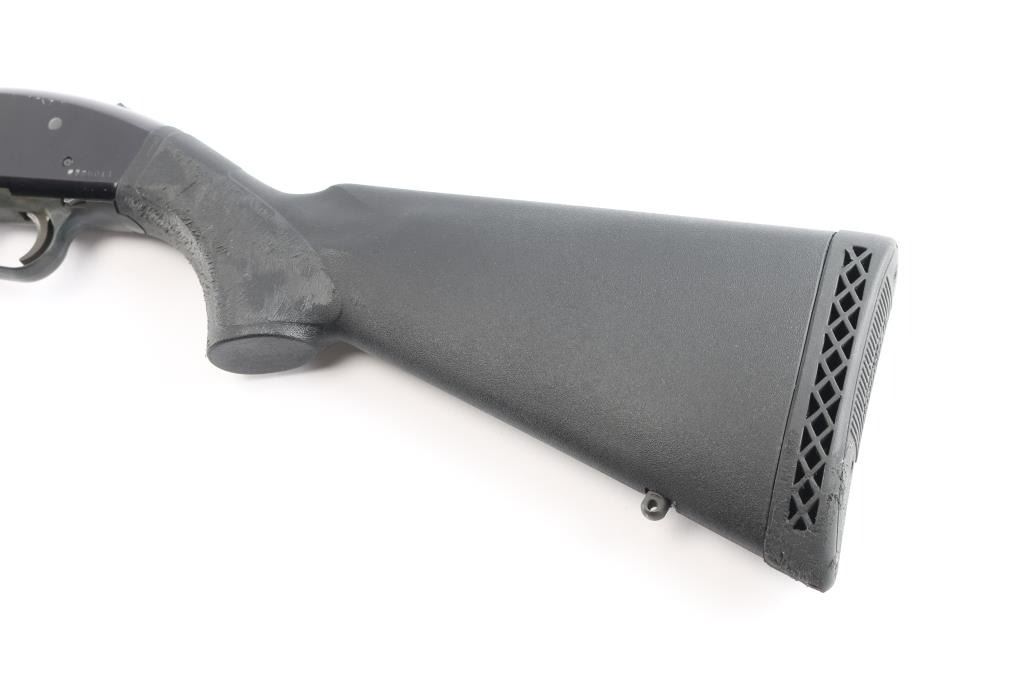 Slide action tactical shotgun, 3" chamber, 20" plain barrel, full length tube magazine, green fiber optic front sight, fixed CYL choke, blue finish with black alloy receiver. Sliding tang safety, smooth trigger. Black polymer grooved slide handle, pistol grip shoulder stock with factory recoil pad. Slide action is smooth, polymer stocks are very good, the grip has a added rough texture for better grip, blue and black are overall very good with some minor scratches/scuffs and the bore is excellent/bright. LOP is 13 1/2".