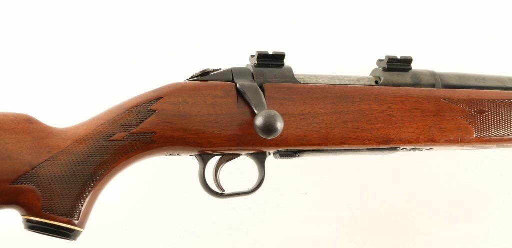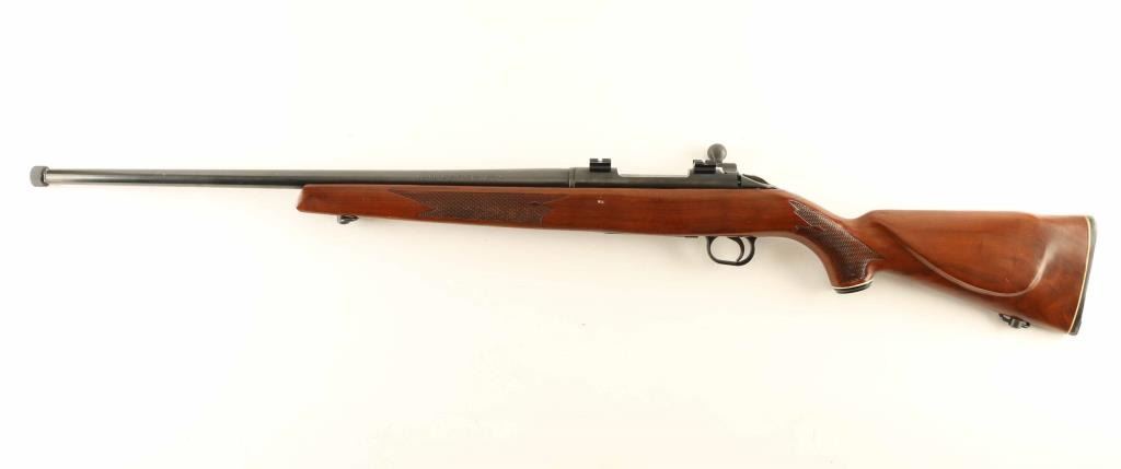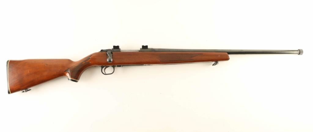Bolt action rifle features blued finish, wood stock with checkering at wrist & forend, sling swivels, plastic buttplate, right handed cheek piece, 22" barrel with threaded muzzle, muzzle thread protector installed, hinged floorplate, manual safety. Bore is excellent. Retains 85% blue, fading to gray on bolt knob, several dings and scratches on barrel. Wood is very good condition with dents and scratches. Condition is NRA Very Good+ *** Modern Firearm ***