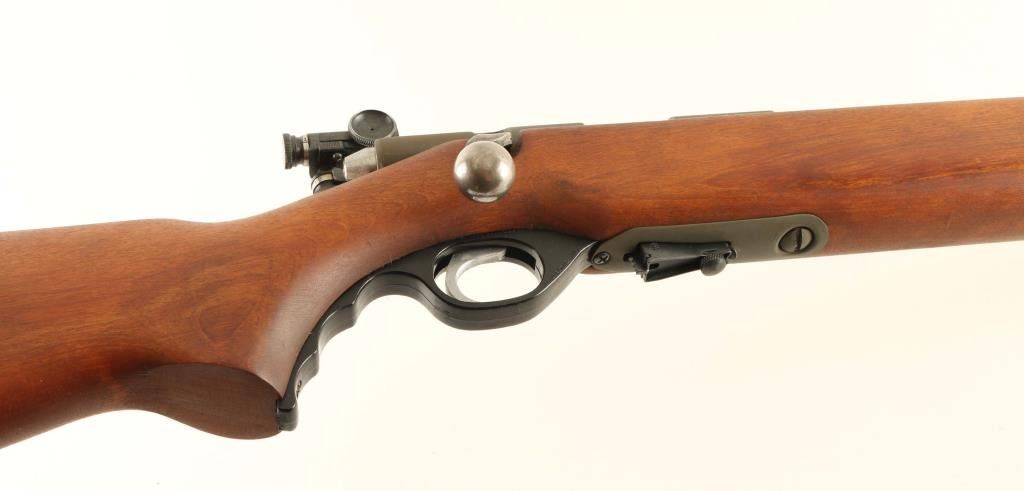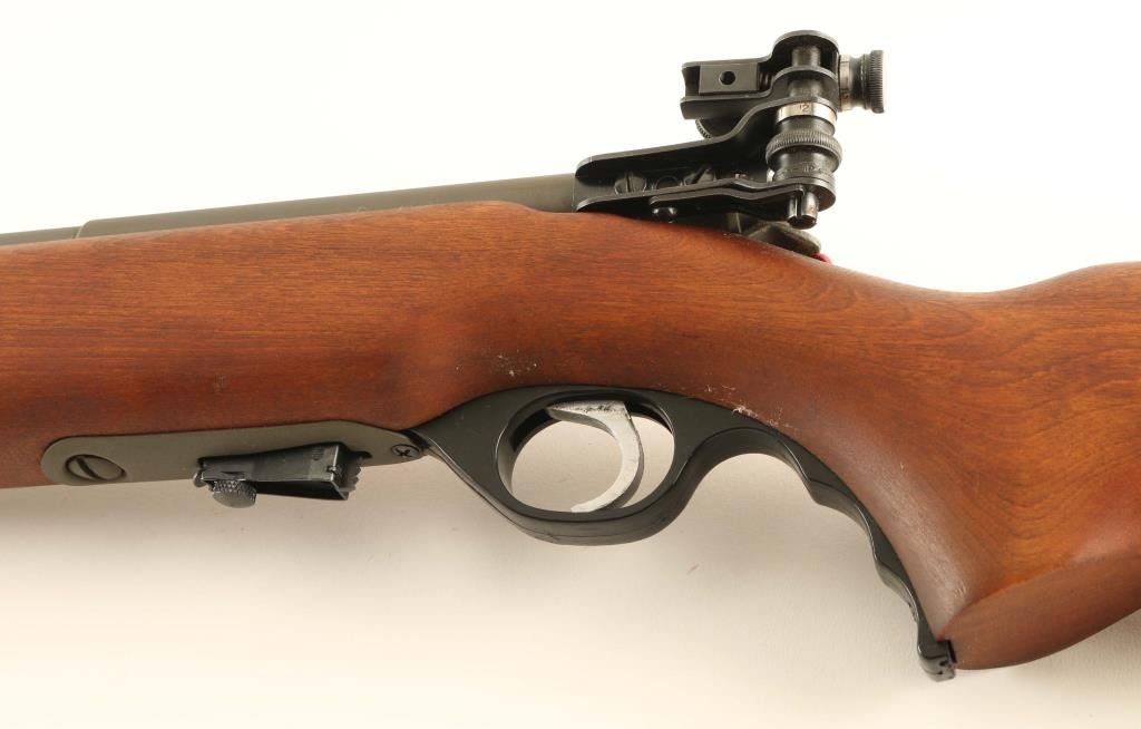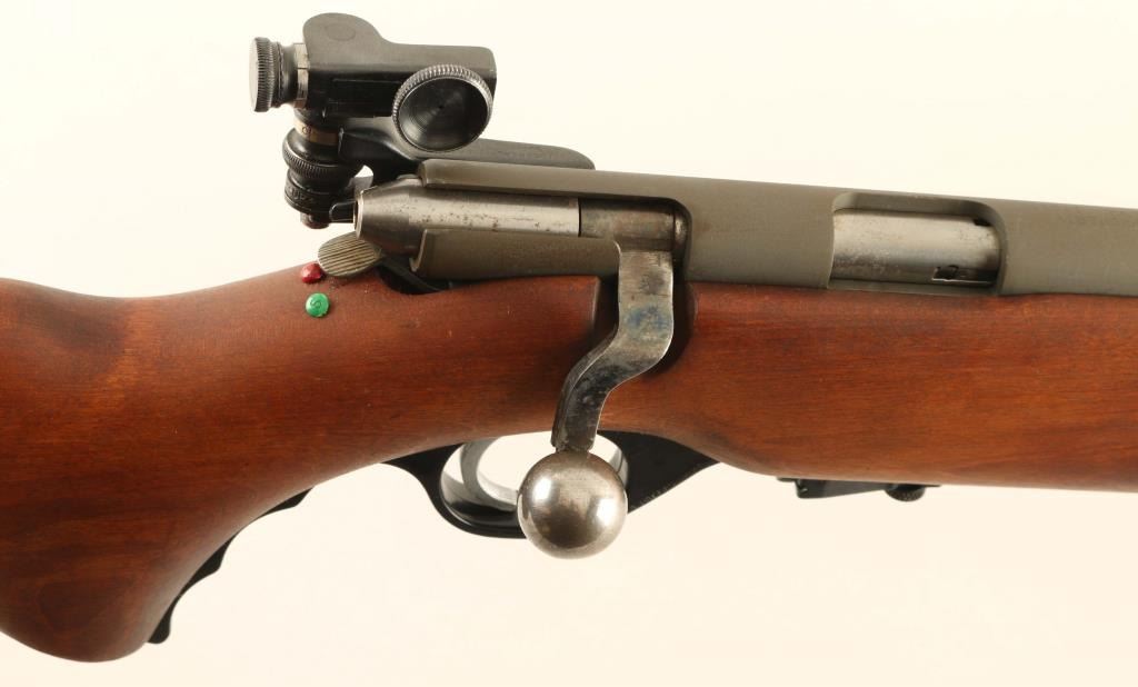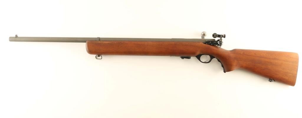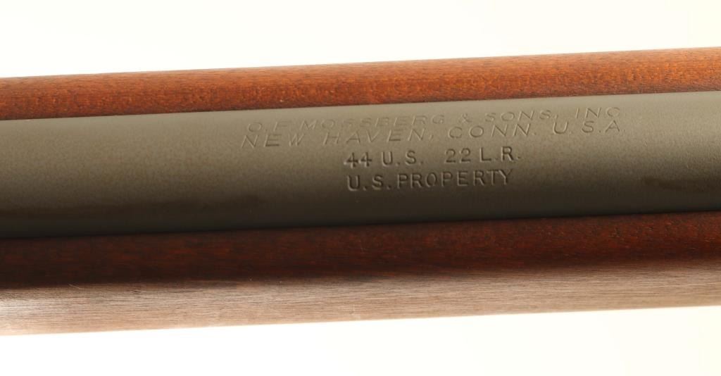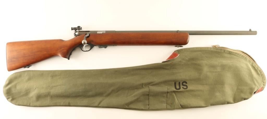 “U.S. PROPERTY" Marked magazine fed bolt action training rifle chambered in .22 Long Rifle, manufactured in New Haven, CT circa 1943-1949. Features a parkerized finish, 26" medium-contour round barrel, dovetailed blade front sight, receiver mounted Mossberg Microclick S-100 adjustable aperture sight, serrated trigger, synthetic trigger guard with finger grooves, cocked indicator on the rear of the bolt, manual safety on the rear of the receiver, case hardened bent bolt handle with round knob, detachable 7 round magazine with removable 1 round limiter, and smooth semi-pistol grip birch shoulder stock with sling swivels & serrated metal buttplate. Includes a “US” marked green rifle cover. Rifle retains approximately 98% of its parkerized finish showing a couple scratches and scattered dried grease. Action is in near of repair as the bolt slides out of the receiver freely & the magazine interferes with the closing/opening of the bolt, the bore is excellent, markings are sharp and the wood stock is fine. Condition is NRA Fair. ***C&R Firearm***
