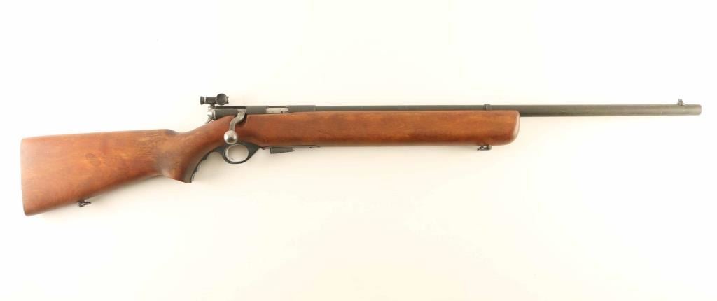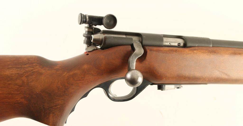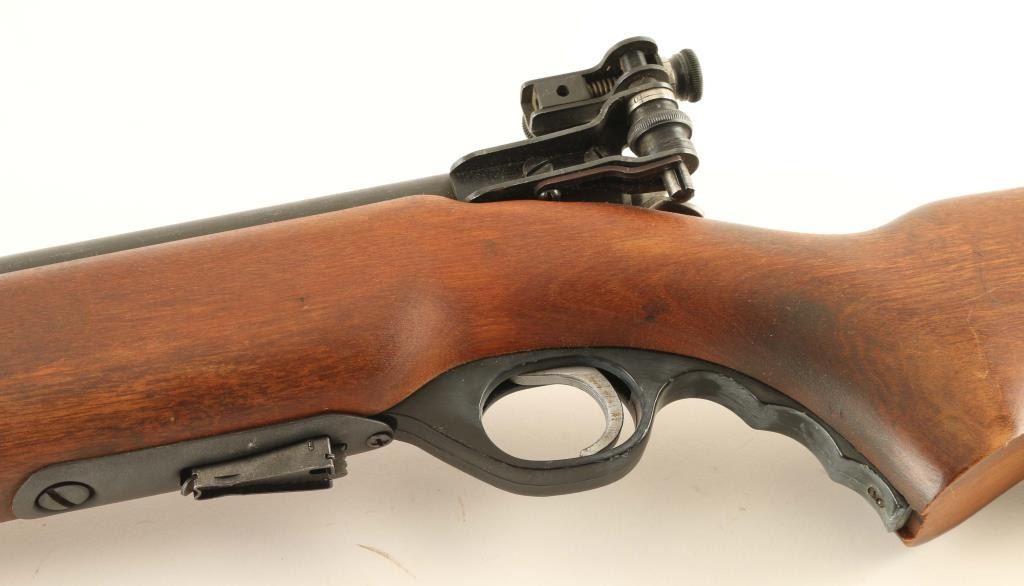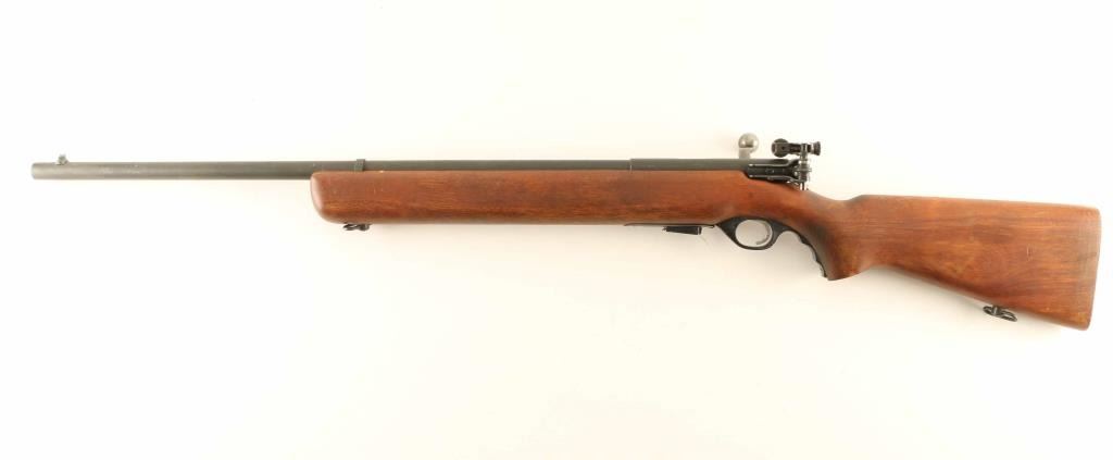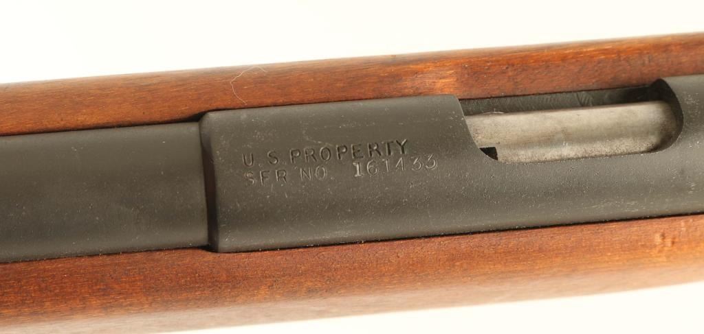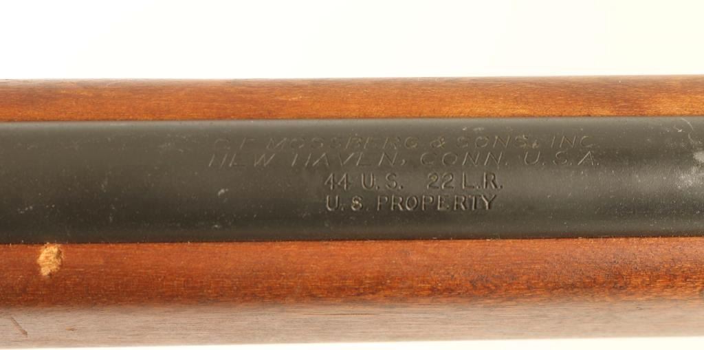 “U.S. PROPERTY" Marked bolt action training rifle chambered in .22 Long Rifle, manufactured circa 1943-1949. Features a parkerized finish, 26" medium-contour barrel, dovetailed blade front sight, Mossberg Microclick S-100 adjustable aperture rear sight, bent bolt handle with round knob, detachable 7 round magazine, serrated trigger, synthetic trigger guard, cocked indicator, manual safety behind the receiver and one-piece semi-pistol grip birch shoulder stock with sling swivels & serrated metal buttplate. Rifle retains approximately 90% of its parkerized finish showing light wear with a mottled finish on the barrel forward of the stock and a browning patina on the unfinished bolt. Action is smooth, the bore is excellent and the wood stock is near fine with minor imperfections. Condition is NRA Very Good+. ***C&R Firearm***