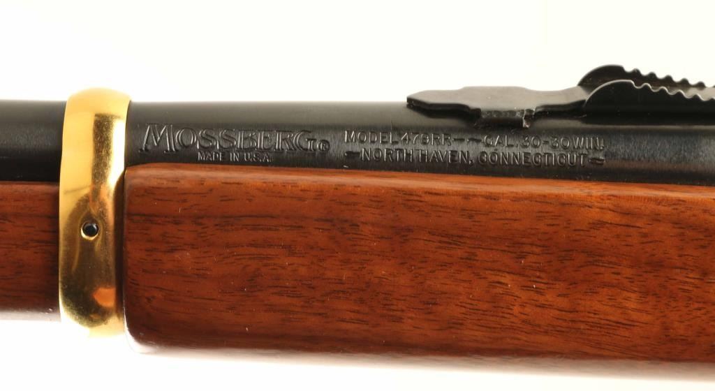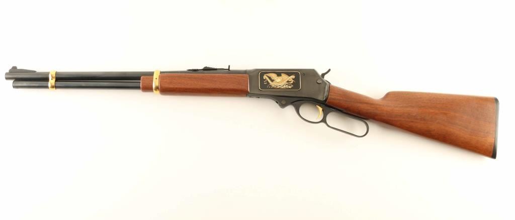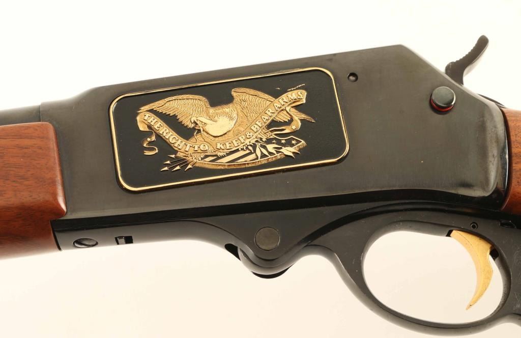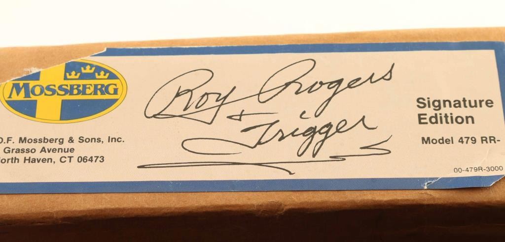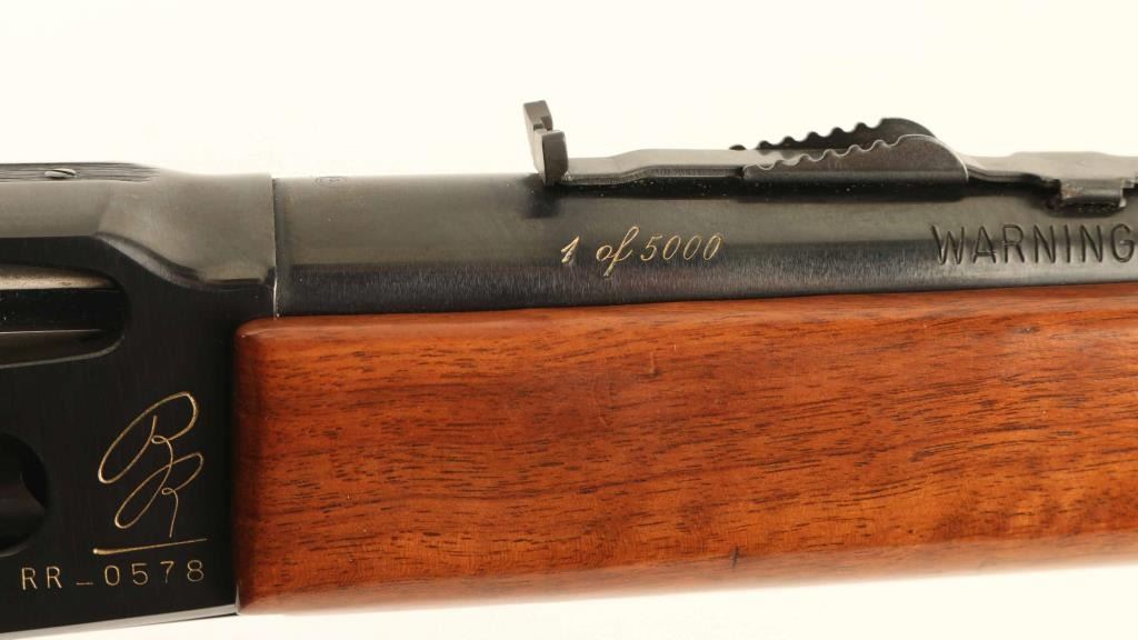 'Roy Rogers Signature Edition 1 of 5000' commemorative lever action rifle features blued finish gold color accents at trigger & bands, gold color inlay engraving, 18" barrel, almost full length magazine tube, buckhorn sights, cross bolt manual safety, top of receiver drilled & tapped for scope mounting (filler screws installed, no mounts or scope included). Bore is very good condition. External condition is excellent, with few handling marks, few scratches to butt. Right side of receiver is engraved & gold colored with "ROY ROGERS & TRIGGER" signed in script, initials "RR", serial number filled with gold color. Bottom edge of "7" has thin color infill, others have very good fill of color. Left side of receiver has an attached plaque with eagle and banner "THE RIGHT TO KEEP AND BEAR ARMS". Right side of barrel is engrave (& gold color filled) "1 of 5000". Includes factory box & info sheet. Condition is NRA Excellent *** Modern Firearm ***
