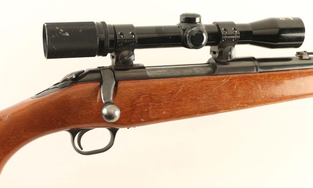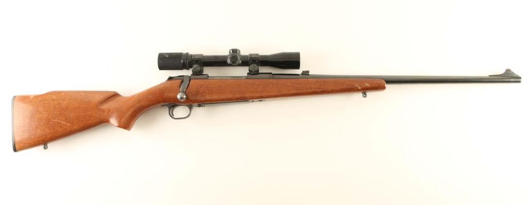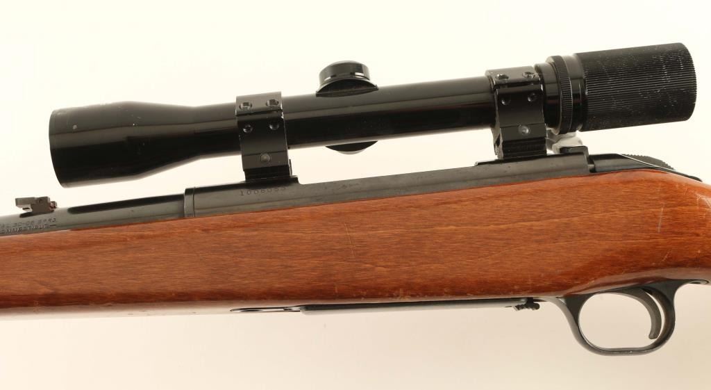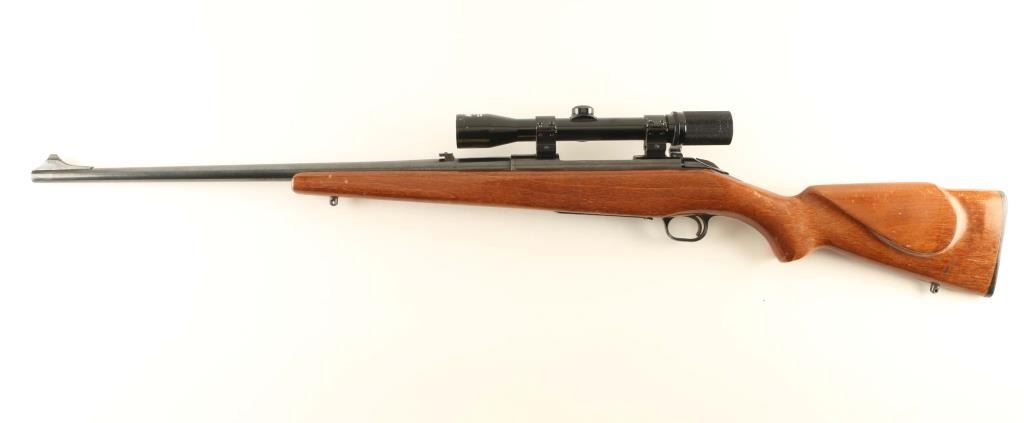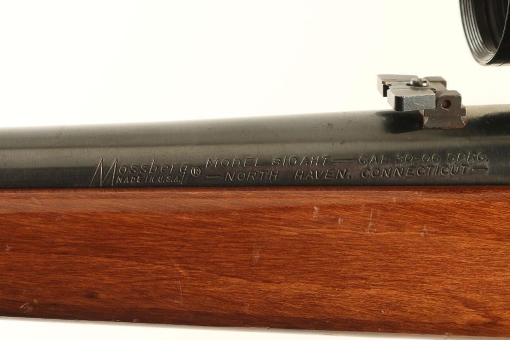 Push feed bolt action sporting rifle chambered in .30-06 Springfield. Features a blued finish, 22” tapered barrel, ramped blade front sight with bead top, adjustable folding leaf rear sight, Mossberg 4x 32mm fixed power scope installed on a two-piece scope rail, smooth trigger, alloy triggerguard/bottom metal, engine turned bolt with turned down handle & sliding safety on the rear, internal box magazine with hinged floorplate, and smooth wood Monte Carlo shoulder stock with right handed cheek piece, swivel studs & serrated buttplate. Rifle retains approximately 85% of its original finish showing scattered wear and light surface rust. Action is sound, the bore is excellent, the optics are clear with fine crosshair reticle and the wood stock is good with many blemishes. Condition is NRA Good. ***Modern Firearm***