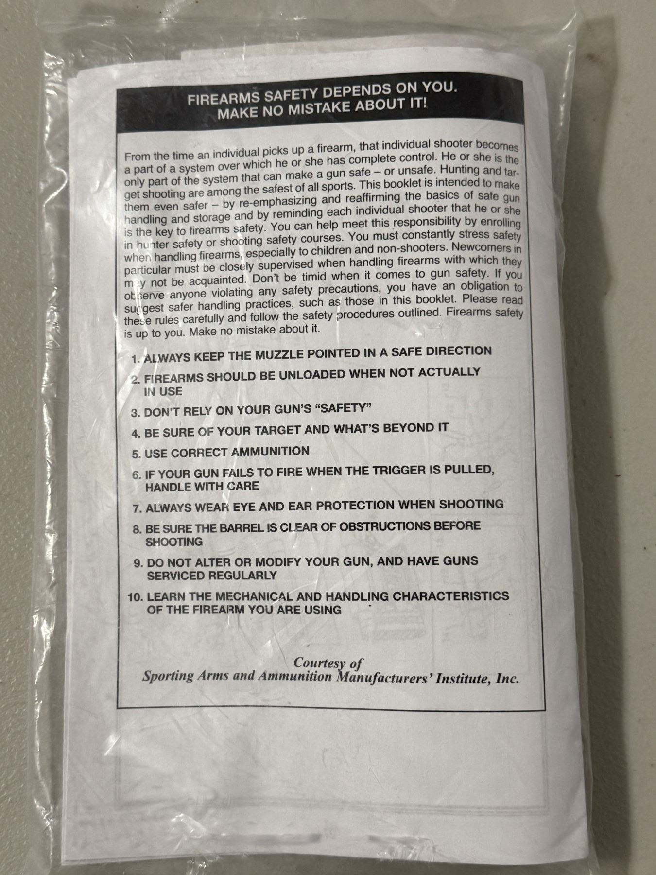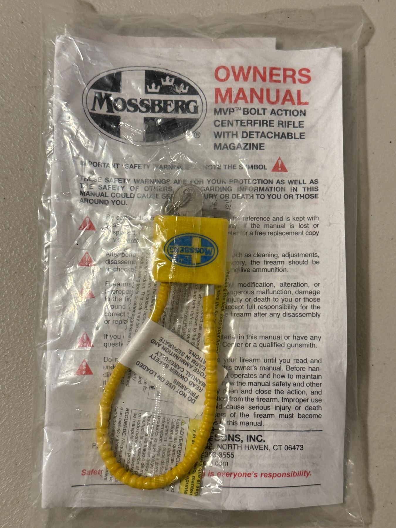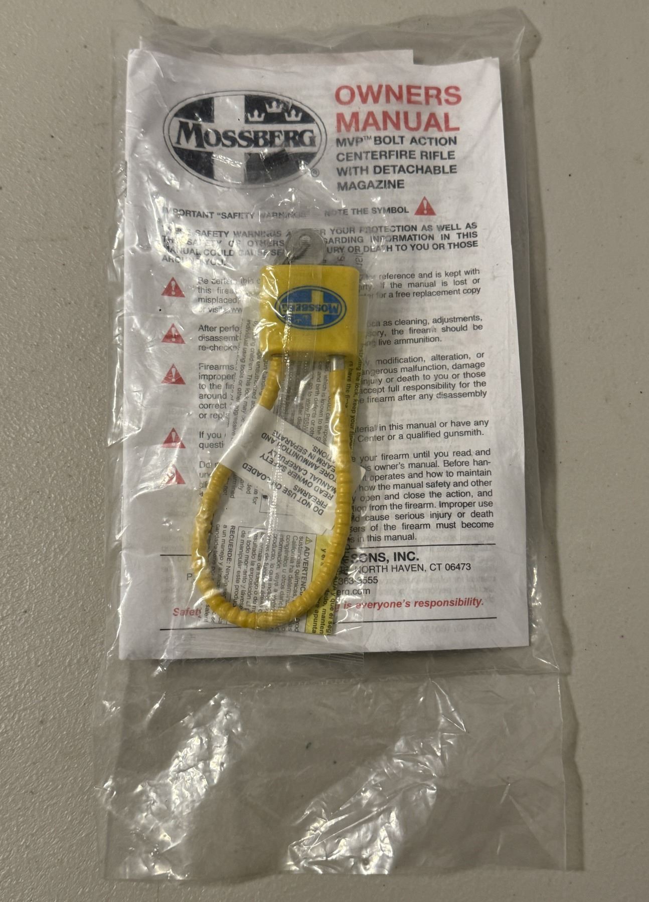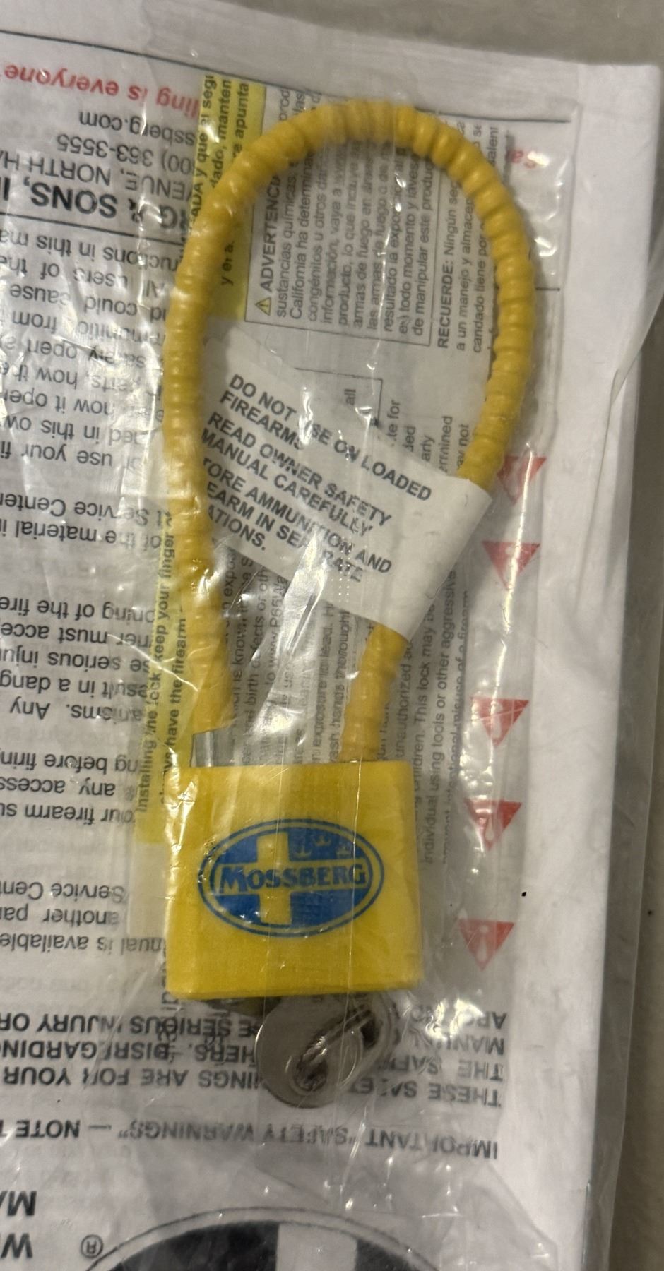 Mossberg firearm safety cable lock with keys, includes original owner’s manual. New/unused condition. Ideal for secure storage and transport.