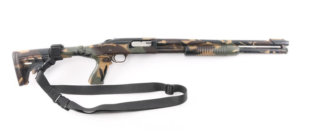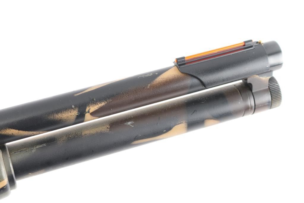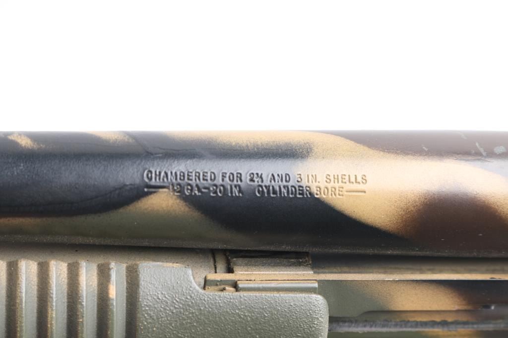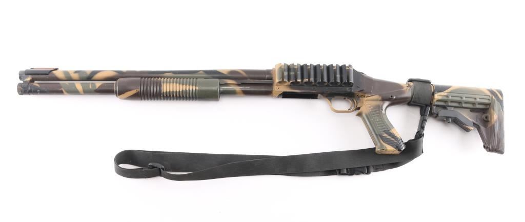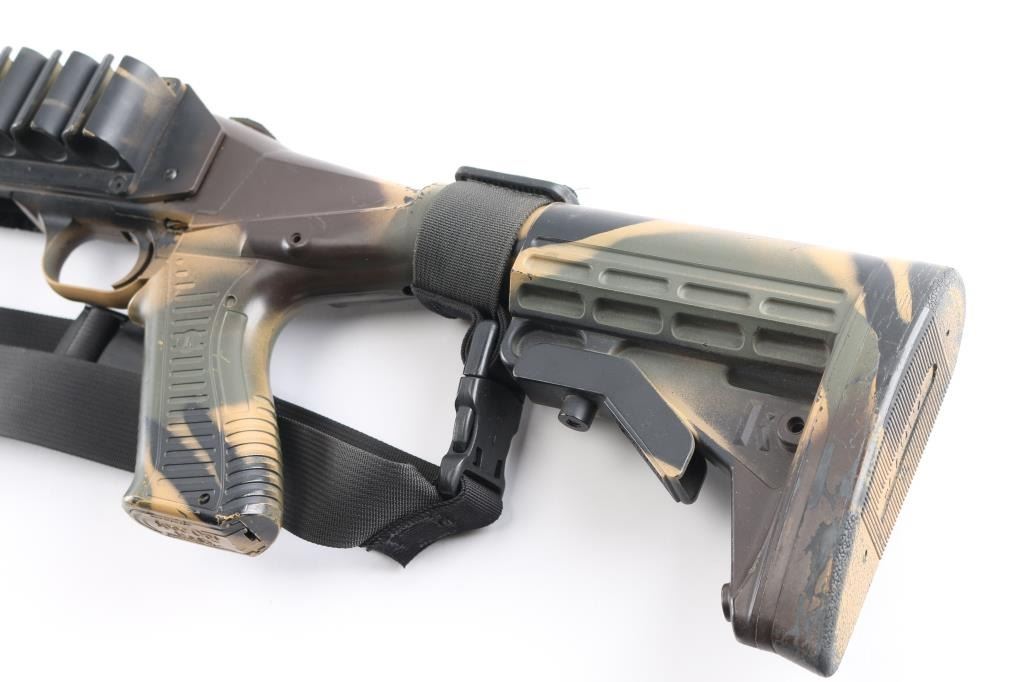 Tactical slide-action shotgun with camo finish, red fiber optic sight, 6 round shell holder installed on left receiver, pistol grip with collapsible AR style shoulder stock. full length 8 rd tube magazine. 20" barrel with fixed cylinder choke, 3" chamber. LOP is 15 1/4' with stock fully extended, tang safety. Bore is excellent/bright, action is smooth, camo finish has some scraps/scratches. Tactical black nylon sling attached.