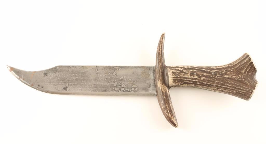 Large steel blade with a resin antler handle. 16 1/2" overall, blade measures 9 3/4". Some surface rust.