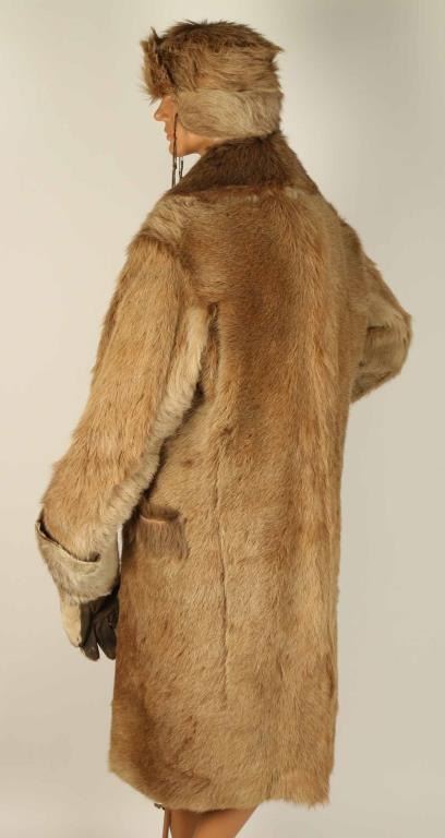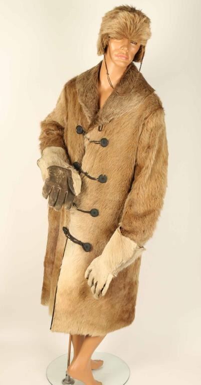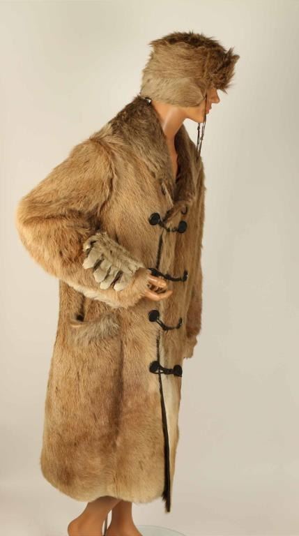 Double breasted knee length trench coat with (8) large buttons and matching gloves and hat. All hand made. Includes display. Approx a mens size large in good condition. (the Display Mannequin must be picked up - no shipping on this item)